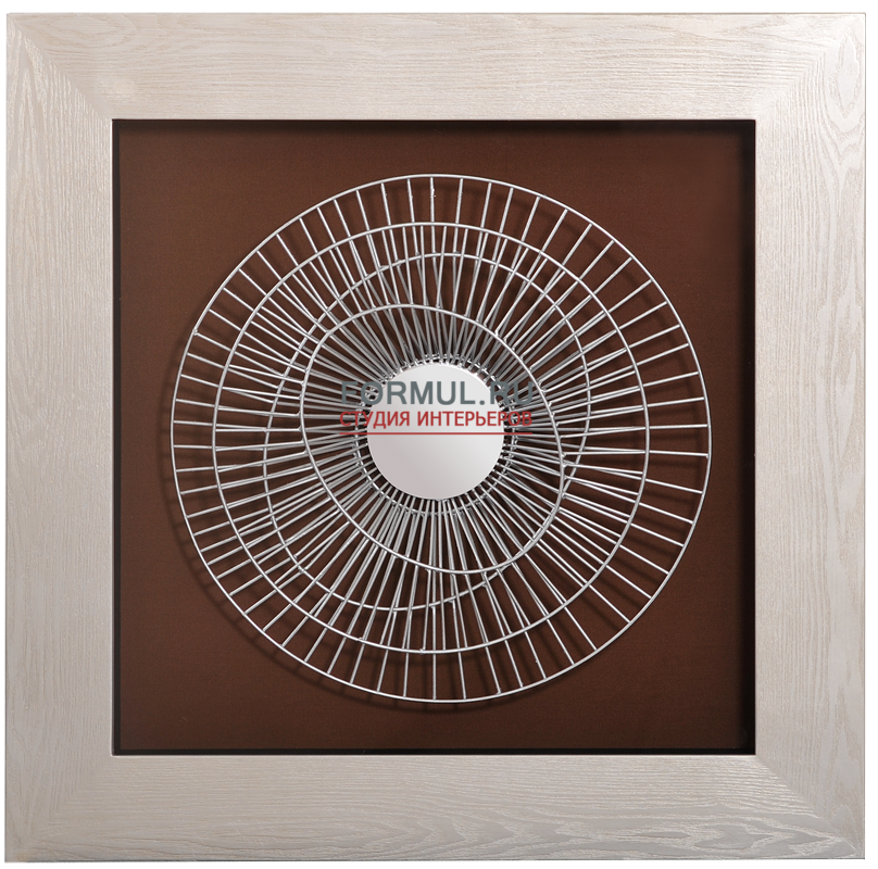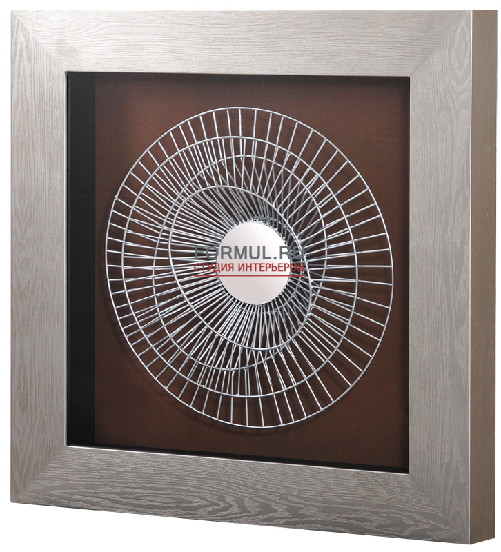 Настенное панно из металла в раме из шпонированного МДФ под стеклом. Цвет рамы серебро, цвет панно - серебро. Подложка выполнена из фанеры обтянутой коричневым холстом.
