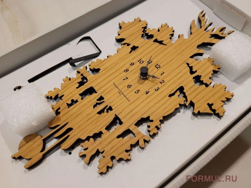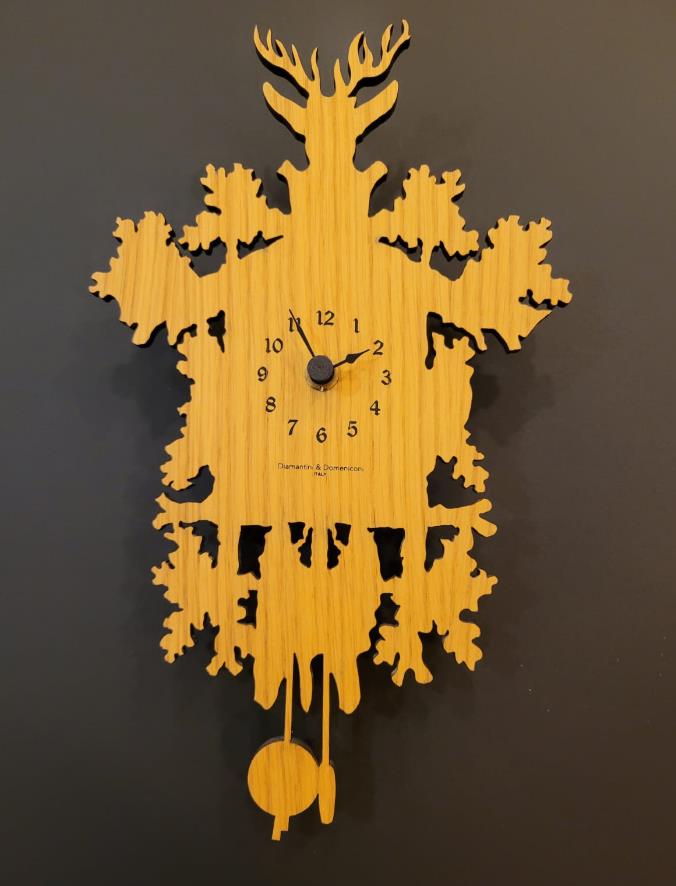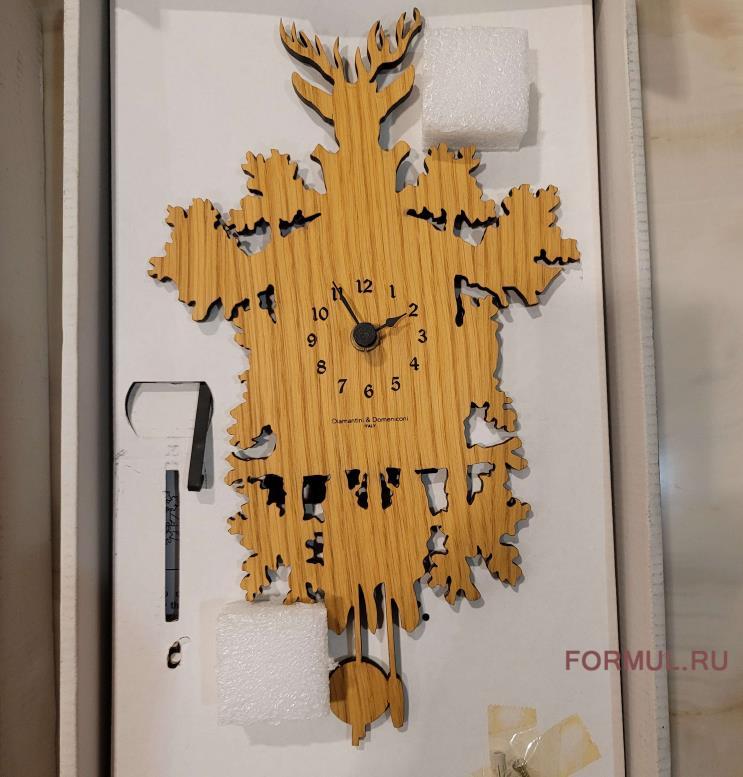 Стильные дизайнерские часы от фабрики итальянской Diamantini & Domeniconi. Причудливые формы и силуэты, на которых можно различить маятник внизу, оленя вверху и ветви дуба по бокам, создает ощущение близости к природе. Этому же способствует и природный дизайн самих часов. Циферблат размещен на деревянном щите цвета дуба.