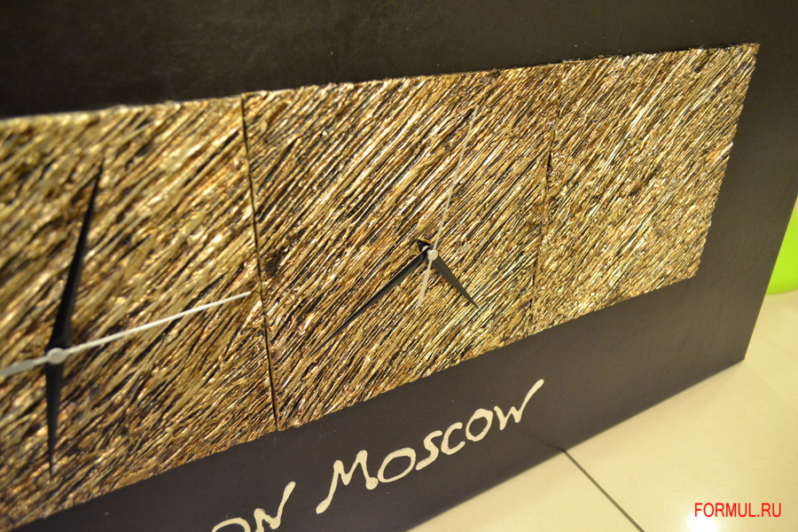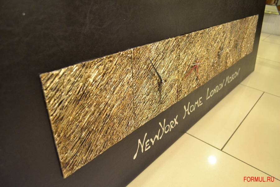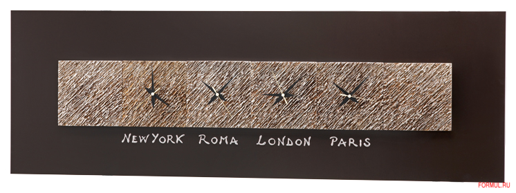 Они оригинальны и притягивают к себе взгляд. На одной панели расположились сразу четыре циферблата, которые показывают разное время: в Нью-Йорке, Москве, Лондоне и домашнее время. Это необычно, интересно и солидно. Часы оттенены золотой панелью, которая располагается на черном фоне рамы, – идеальное сочетание. Все стрелки черные, кроме домашних – они выделены красным цветом.
