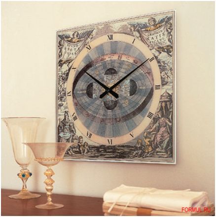 Корпус часов квадратной формы выполнен из закаленного стекла с художественной шелкографией. В основу дизайна этих часов легли географические открытия - в центре изображена карта. А круглый циферблат обрамлен рисунками библейской тематики. Каждый элемент оформления этих часов тщательно продуман лучшими итальянскими дизайнерами, благодаря чему складывается единая картина. Размер часов 60Х60 сантиметров.