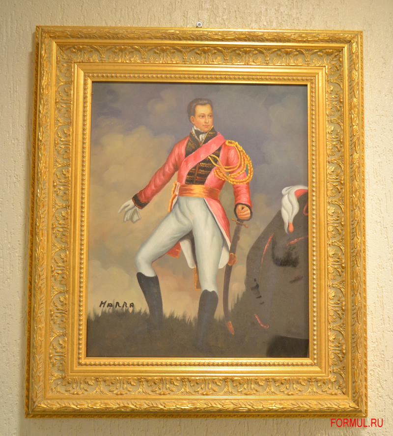 Офицер изображён на фоне несколько тревожного романтического пейзажа. Грозное затянутое тучами небо, срывающий с деревьев листья ветер — всё это невольно наводит на мысли о мятежной душе внешне спокойного и одухотворённого героя. Такой портрет прекрасно подойдет к помещениям, оформленным в духе наполеоновских времен, дополнит строгую, но роскошную официальность оформления кабинетов или залов, где предполагается поражать гостей величием и помпезностью.