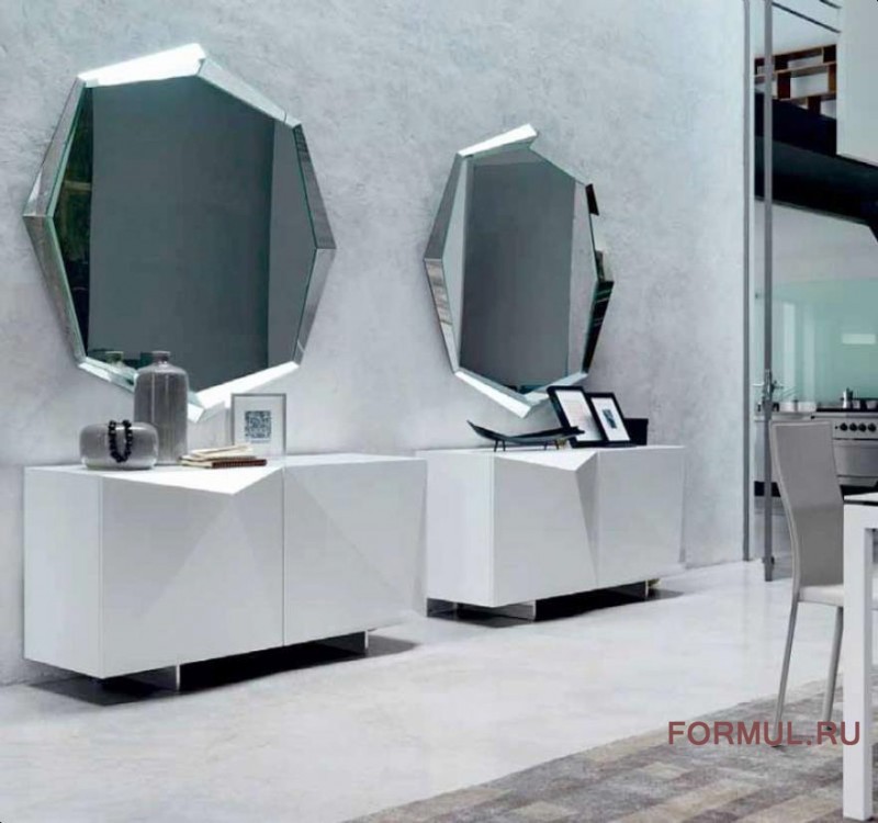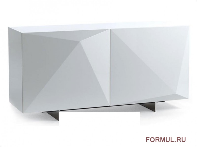 Комод с асимметричными фасадами Kayak – необычная модель в современном стиле с футуристическими дверцами неправильной геометрической формы. У комода 2 секции в каждой секции одна стеклянная полка, глянцевый лаковый фасад комода представлен в белом цвете, тонкие профилированные ножки из стали графитового цвета. Внутренние полки – прозрачное стекло.