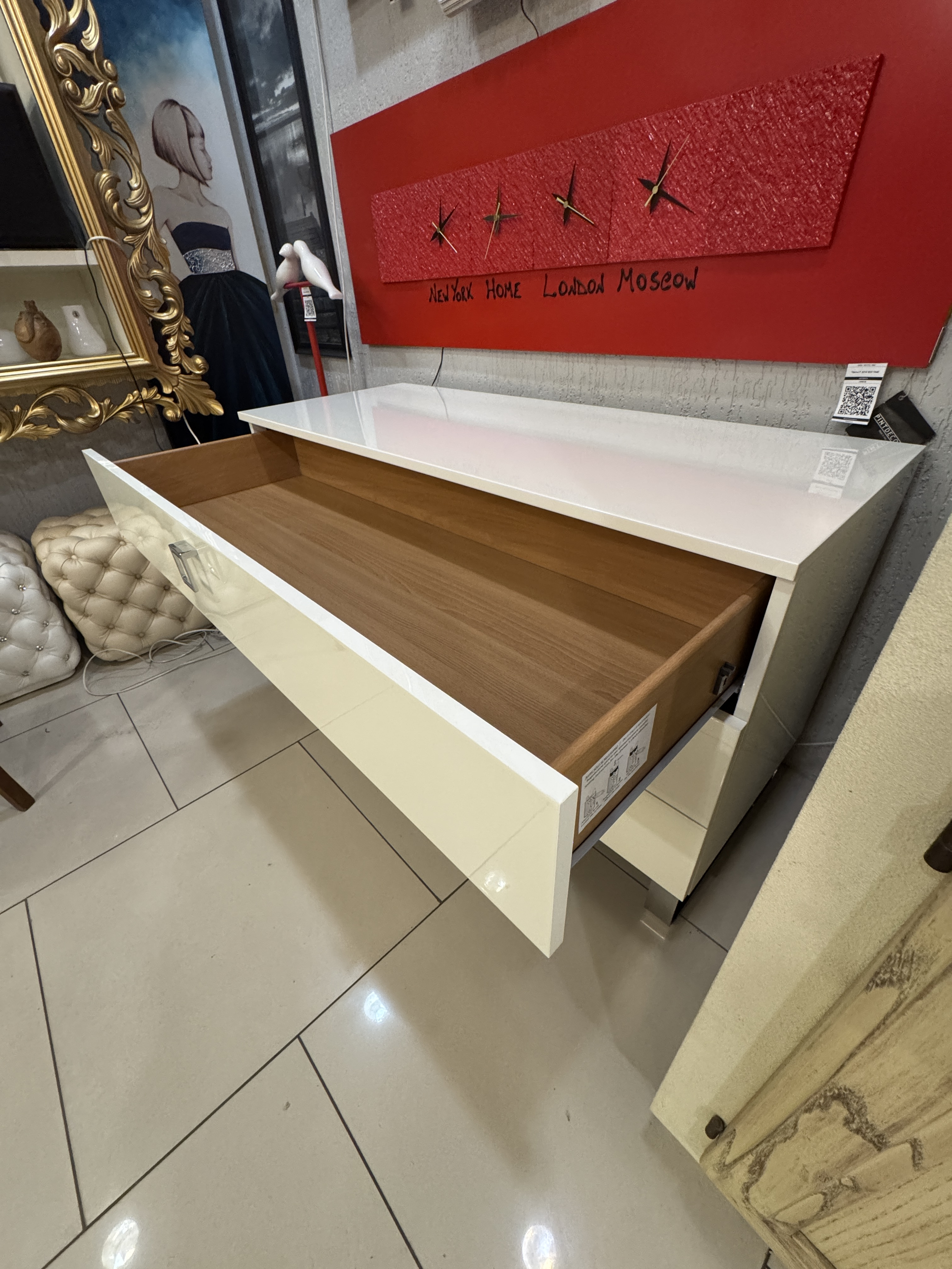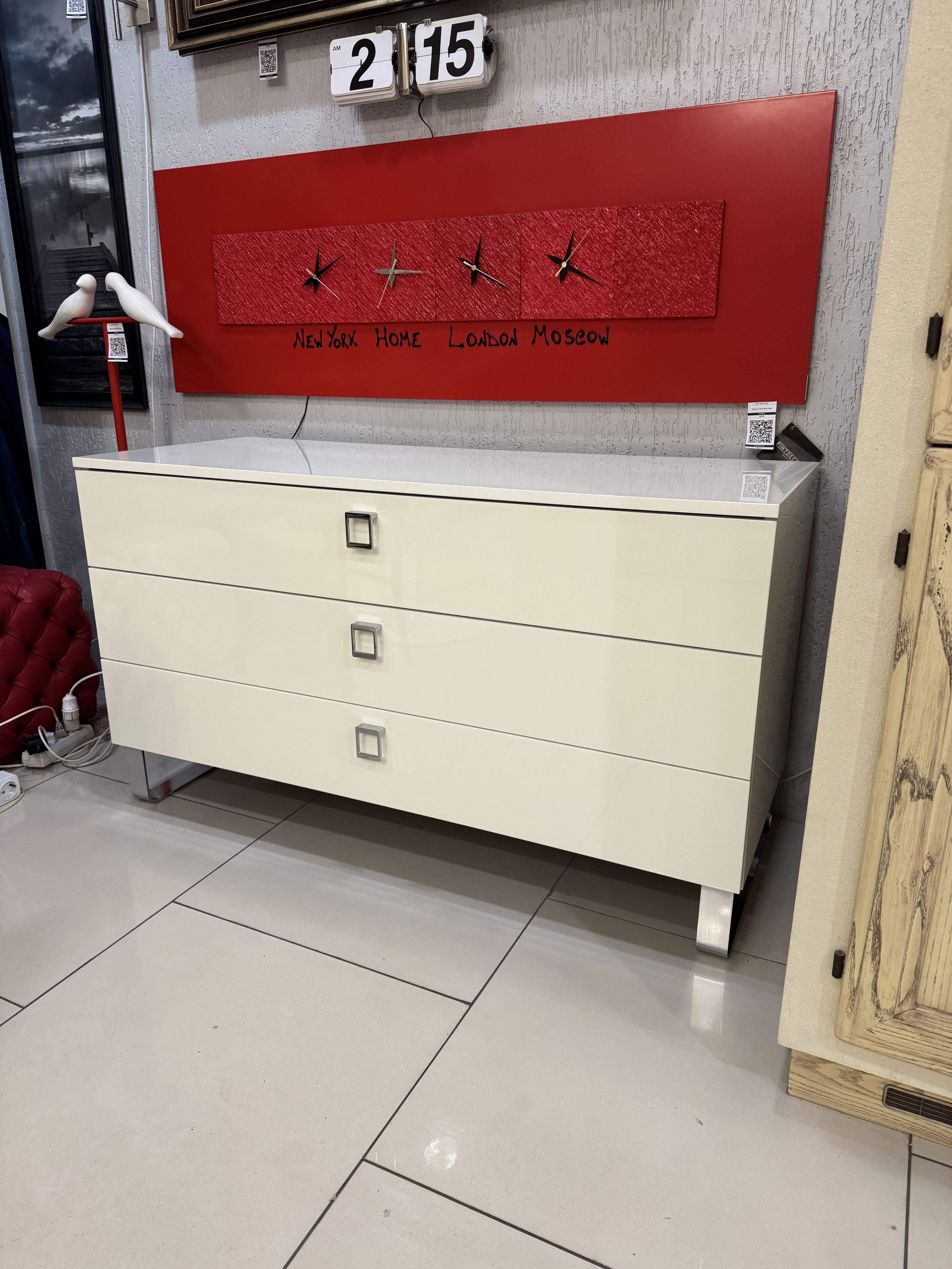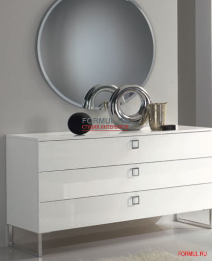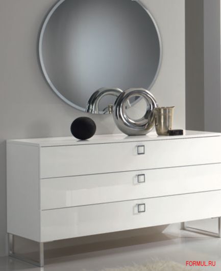 Особенности: комод с тремя выдвижными ящиками с доводчиками, с хромированными ножками. Покрыт высококачественным лаком белого цвета в 7 слоев.