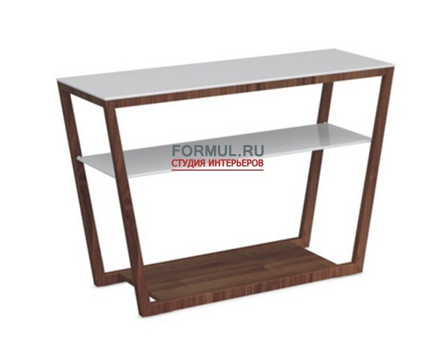 Стильный довольно высокий – 80 сантиметров - столик по своей архитектонике представляет собой трапецию, сужающуюся к низу. Геометрические вертикальные формы поддерживает не только столешница, но и две полочки, одна из которых расположена в основании изделия. Ножки и нижняя полочка выполнены из дерева. Столешница и еще одна полочка из белого закаленного стекла. При ширине в 40 и длине в 120 сантиметров, консоль может служить подставкой под телевизор, но в своем прямом назначении – под зеркалом - будет особенно уместна. Дизайнерскую вещь от итальянской фабрики с почти столетними традициями можно приобрести недорого. В наличии нашего магазина консоль CB/5044-A ELEMENT в цвете орех. Качественные предметы мебели от итальянских производителей реализуются со скидкой как единичные остатки.
