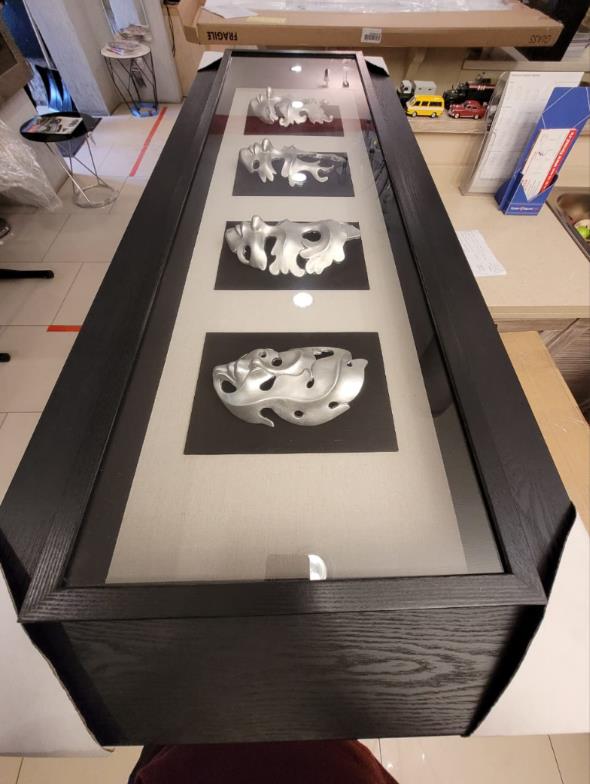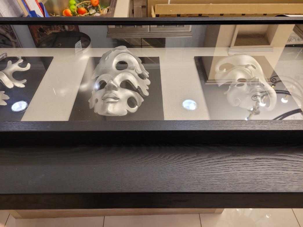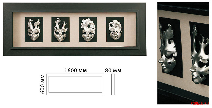 Рамка выполнена из массива натурального дерева, покрытого насыщенным черным цветом. Сами интерьерные маски — цвета серебристого металлика. Вся эта красота размещена на паспарту из кремового холста и бережно спрятана под стекло.