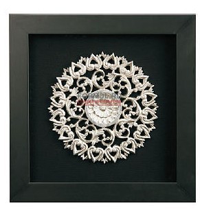 Настенное панно в деревянной рамке под стеклом отличается внушительными размерами –500х500х40 мм. Узор оттенка металлик, оформленный изящной окружностью, на черном фоне смотрится необыкновенно стильно. Сдержанный, роскошный коктейль, состоящий из контрастной композиции, идеально подойдет и в жилой интерьер, и в рабочее пространство.