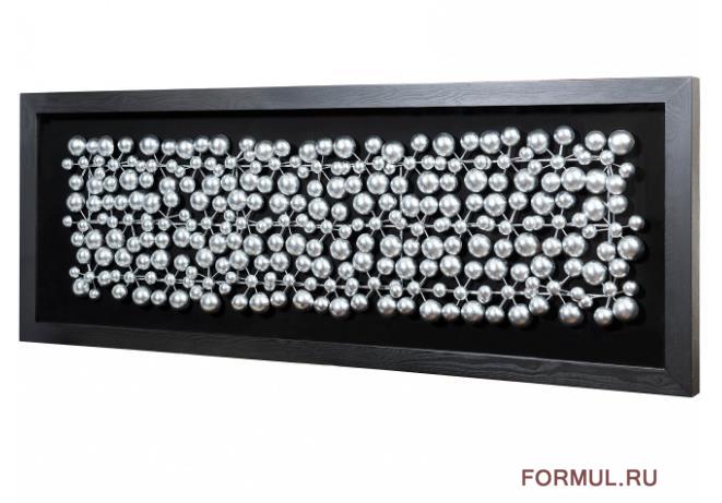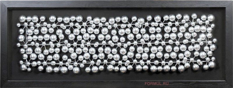 Панно "Молекулы" — это настенное панно из металла в раме из шпонированного МДФ под стеклом. Цвет рамы черный с текстурой дерева, цвет панно - серебро. Подложка выполнена из фанеры обтянутой черным холстом. Данное панно можно вешать на стену как вертикально так и горизонтально.