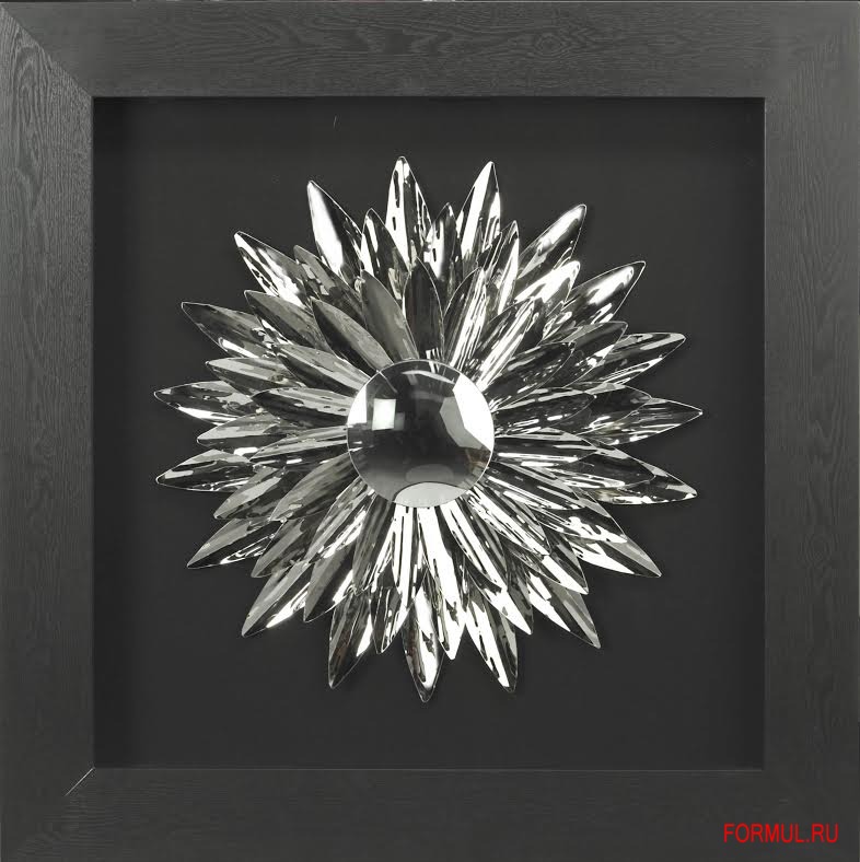 Панно состоит из декоративного элемента в виде расходящихся металлических лучей, которые устремляются из центра серебряной выпуклой полусферы. Рамка выполнена из массива натурального дерева. Вся эта красота лежит на черной тканевой основе и размещена под стеклом. Черный цвет прекрасно подчеркивает и выделяет хромированное серебряное творение мастера.