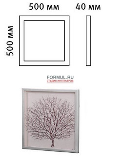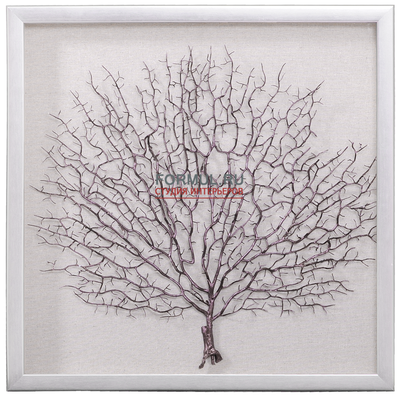 Панно под названием «Кораллы 5» итальянской фабрики Bello Pittura. Настенное панно выполнено на бежевом холсте. Кораллы окрашены в темный бордовый. Рамка сделана из МДФ экологичного материала, цвет серебряный. Панно имеет квадратную форму. Размеры 500 на 500 мм и толщина 40 мм.