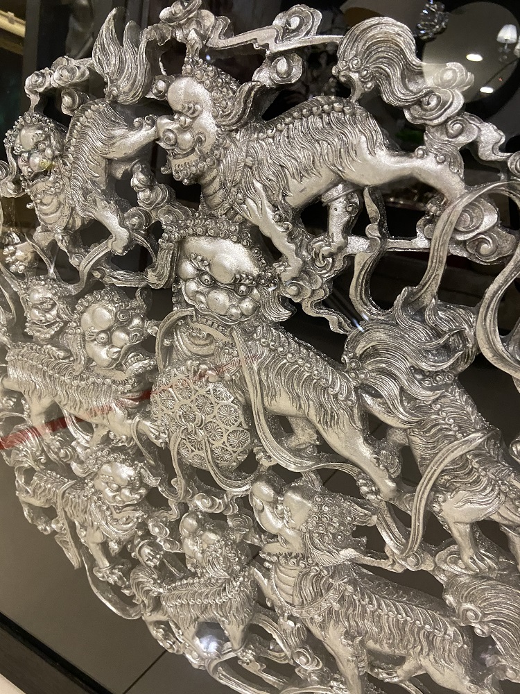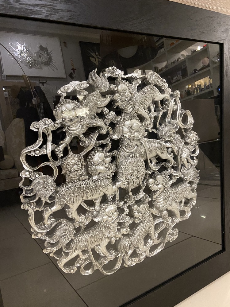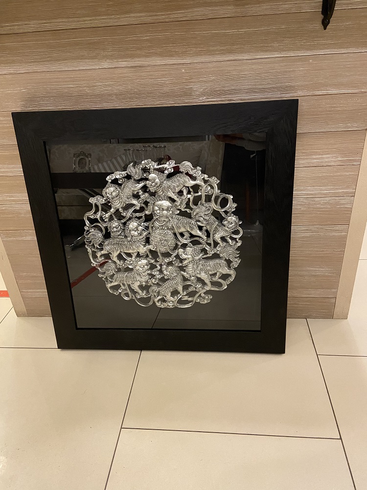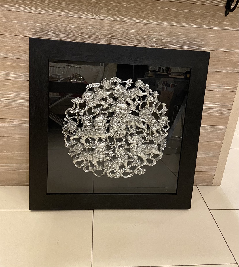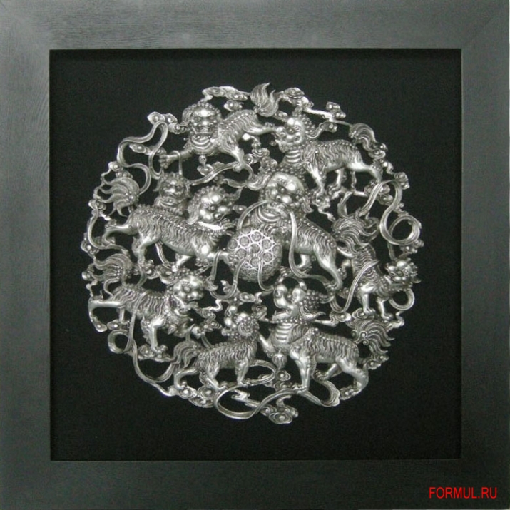 Панно состоит из декоративного элемента в виде мифических животных и рамки, выполненной из массива натурального дерева. Вся эта красота лежит на черной тканевой основе и размещена под стеклом. Черный цвет прекрасно подчеркивает и выделяет чудесное серебряное украшение.