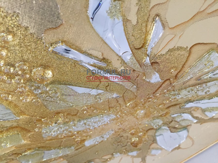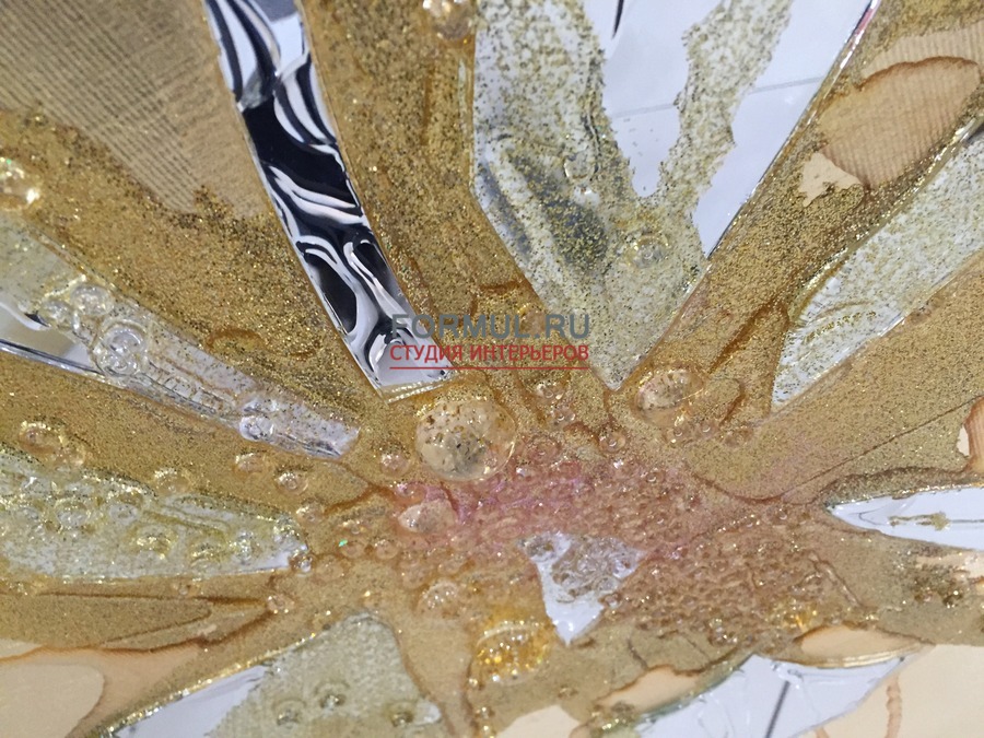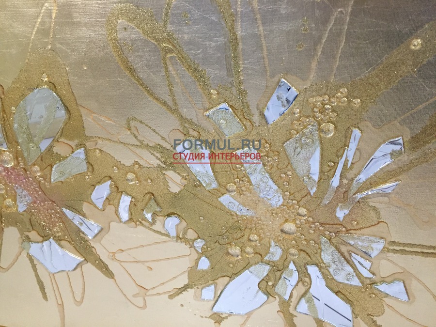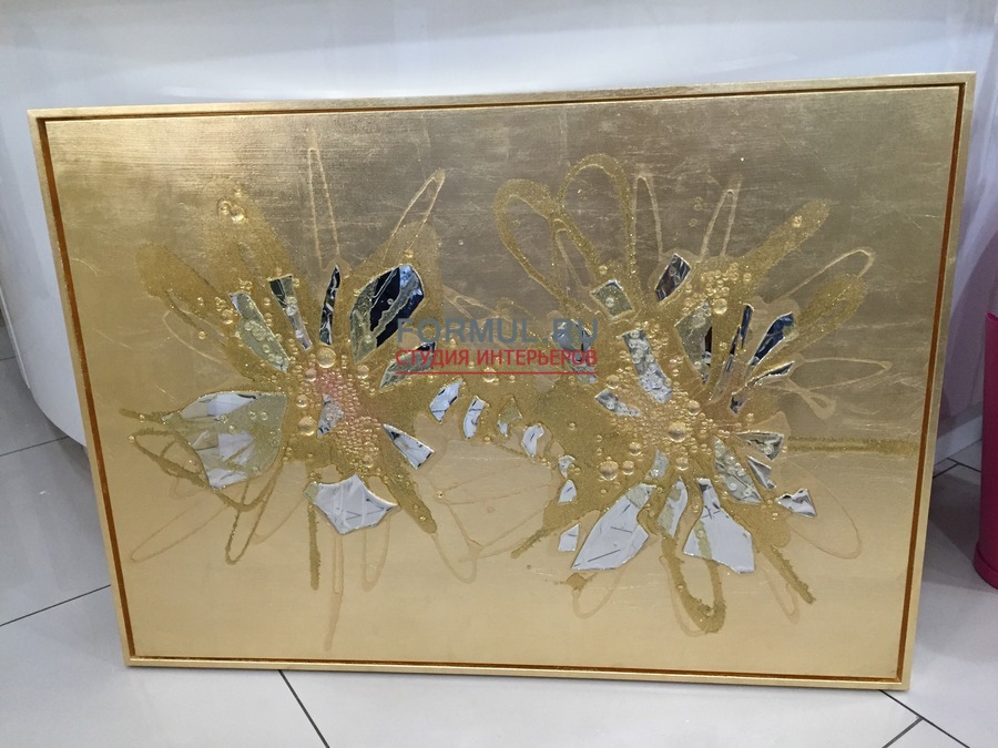 На пастельном фоне панно распустилось два цветка, сквозь лепестки которых проглядывают зеркальные вкрапления черного цвета, разбавляя золото лепестков и подчеркивая их скульптурность и в то же время нежность и хрупкость. Все детали изысканны и эффектны.