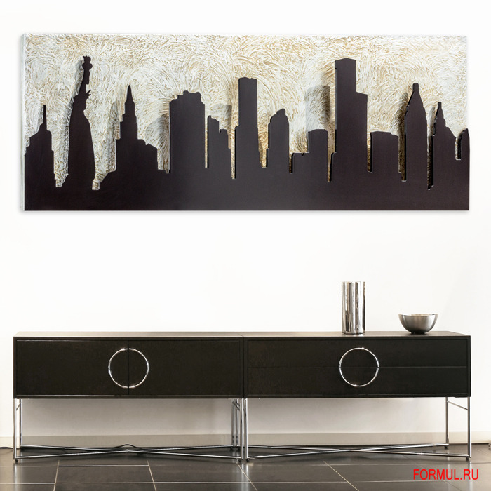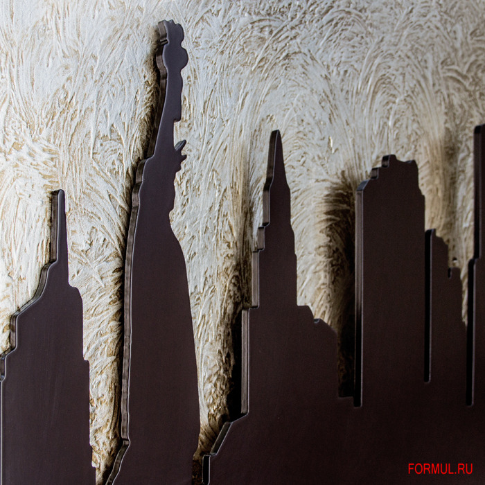 Здесь изображен силуэт Манхэттена — одного из пяти районов Нью-Йорка. Небоскребы цвета шоколада стройной шеренгой расположены на фоне серебристого с золотым отливом холста. Особо выделяется силуэт всемирно известной Статуи Свободы — олицетворение всей Америки. Знаменитый район протянулся вдоль реки Гудзон на 21 километр. Изображение завораживает своим видом и не оставляет равнодушным ни один взгляд.