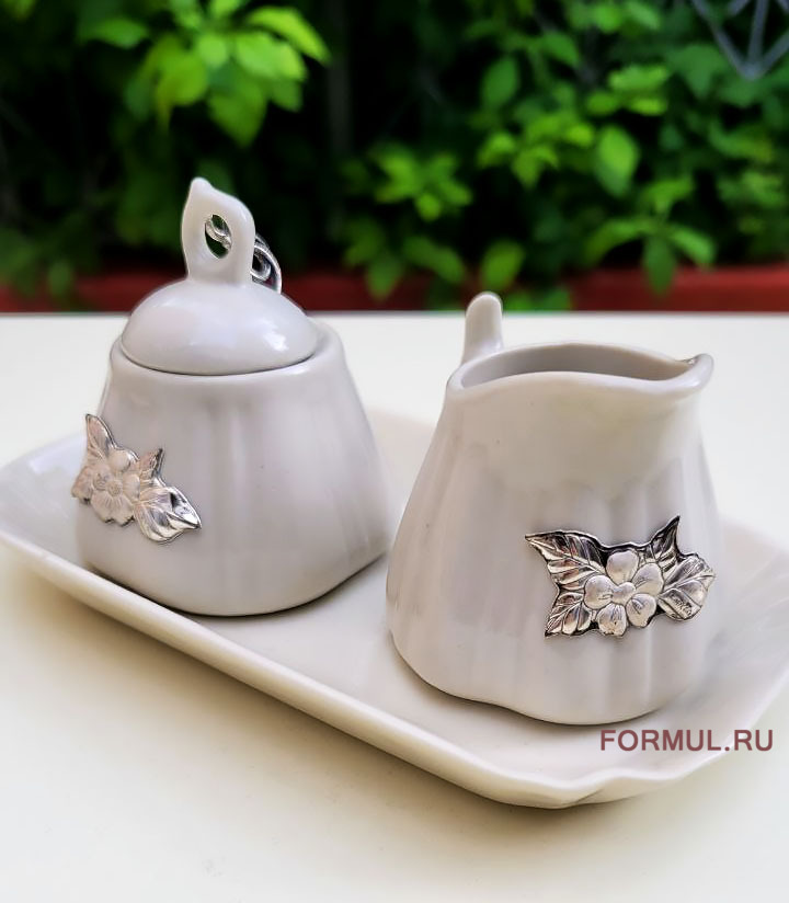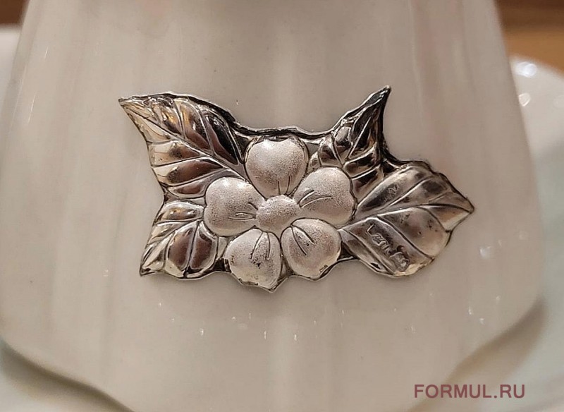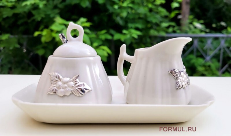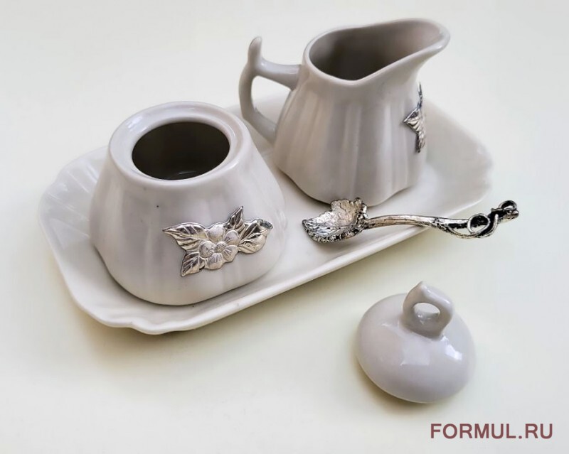 Комплект выполненн из высококачественного фарфора и дополнен декоративными элементами из серебра. Ручная работа гарантирует высокое качество изделий и их долговечность.