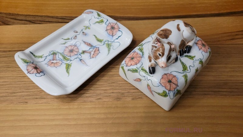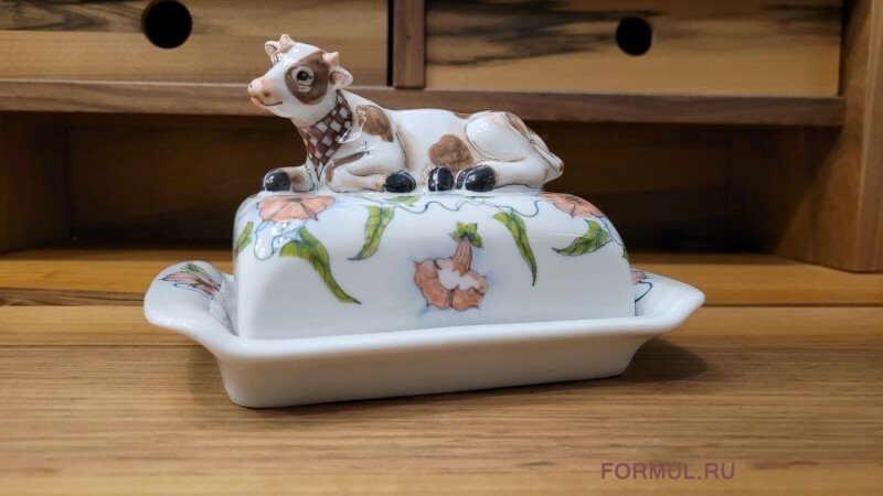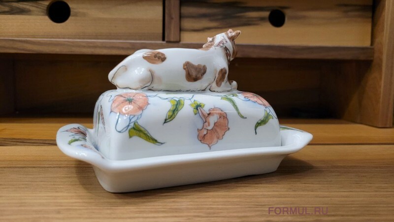 Необычная фарфоровая масленка точно не оставит никого равнодушным, ведь на крышке гордо уместилась ответственная за сливочное масло, по совместительству являюющаяся ручкой корова Зорька.