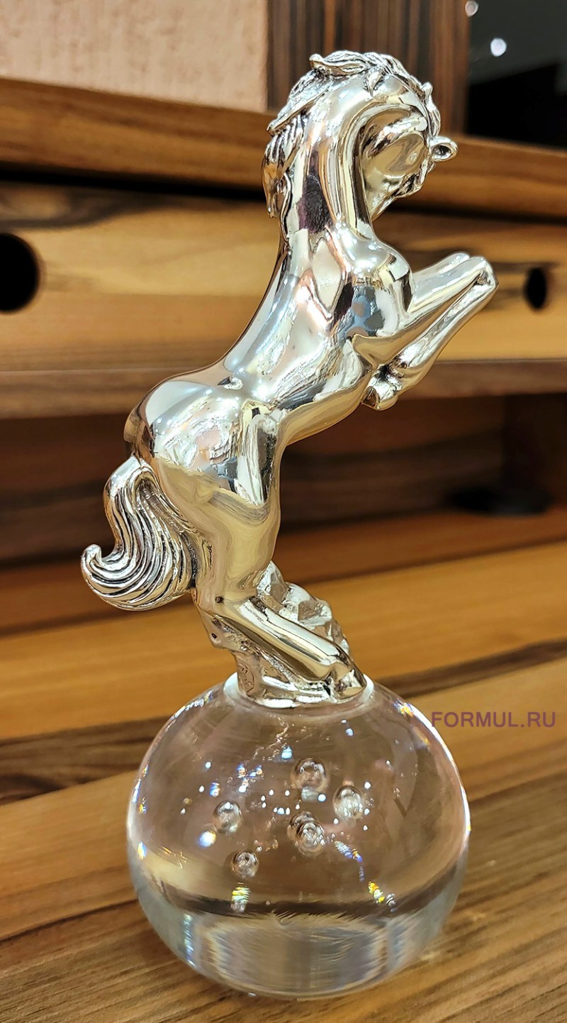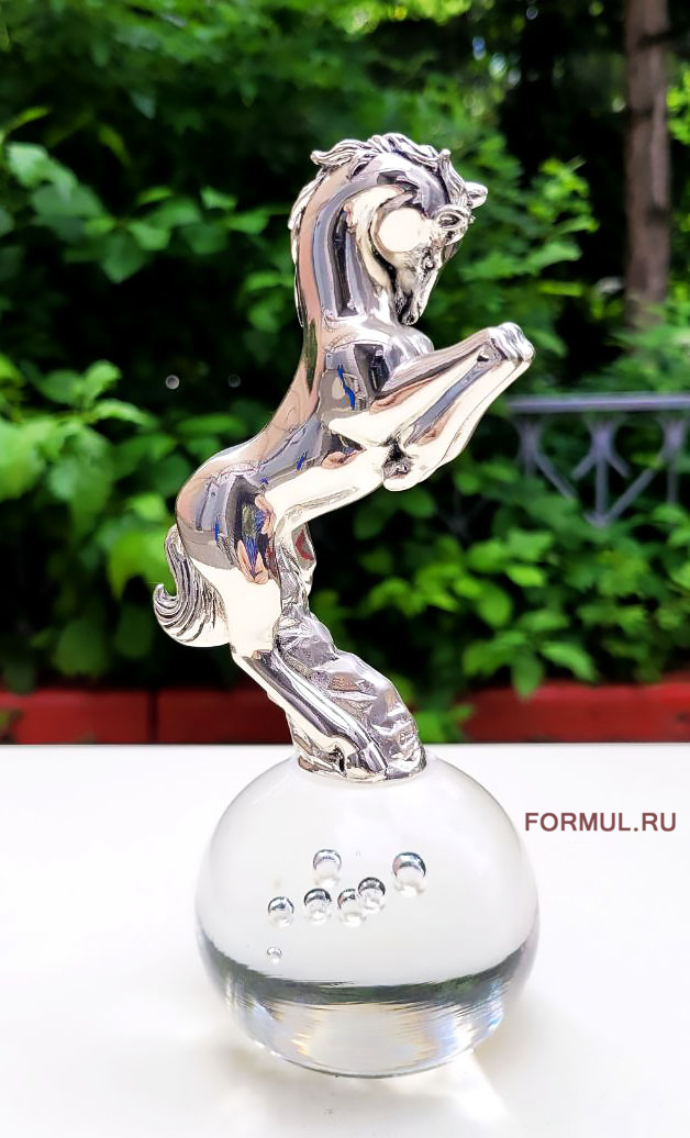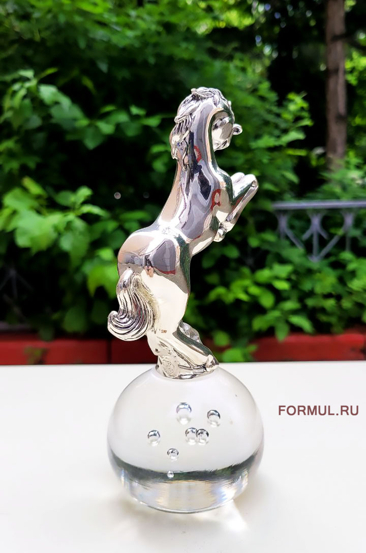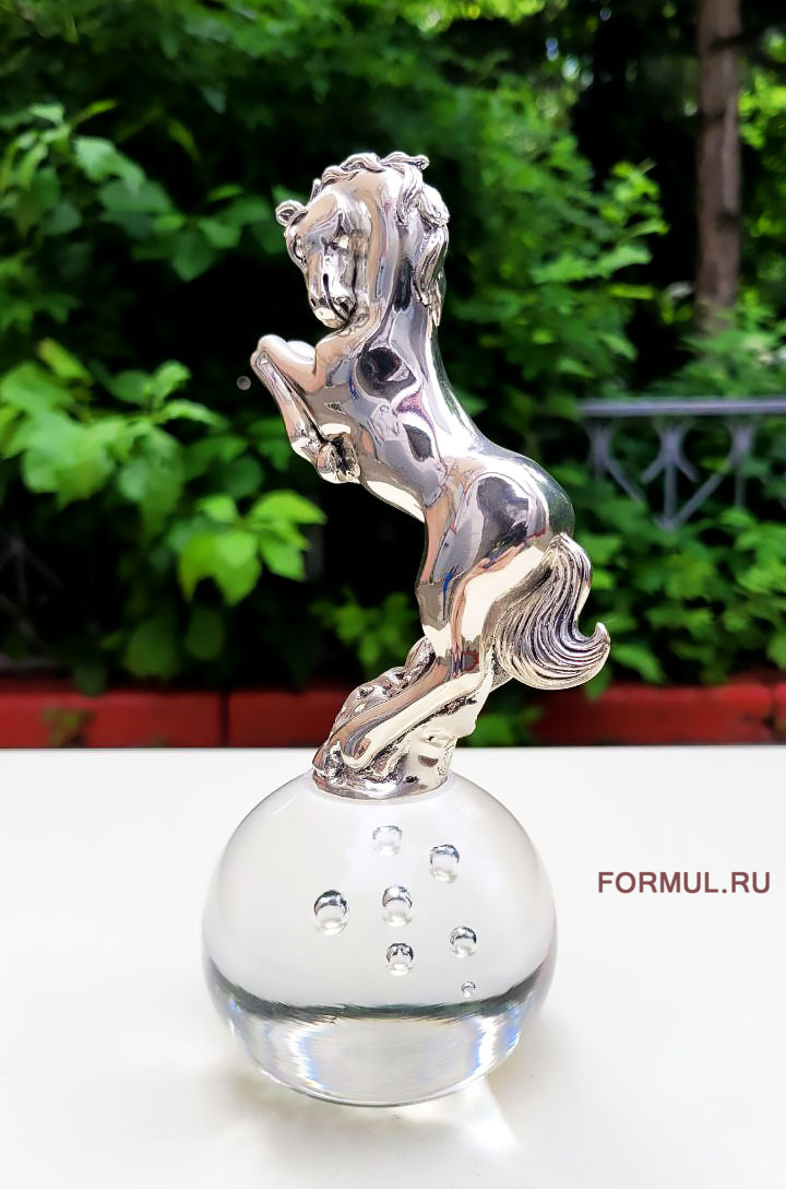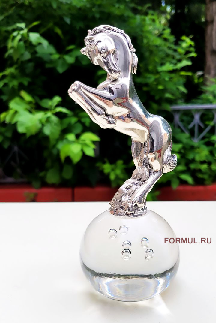 Хромированное покрытие придает ему блеск и современный вид. Он установлен на стеклянном шаре диаметром 7 см, что придает композиции легкость и воздушность, конь как будто завис в воздухе. Хромированное покрытие добавляет изысканности и отражает окружающий свет, создавая эффект блеска и объема.