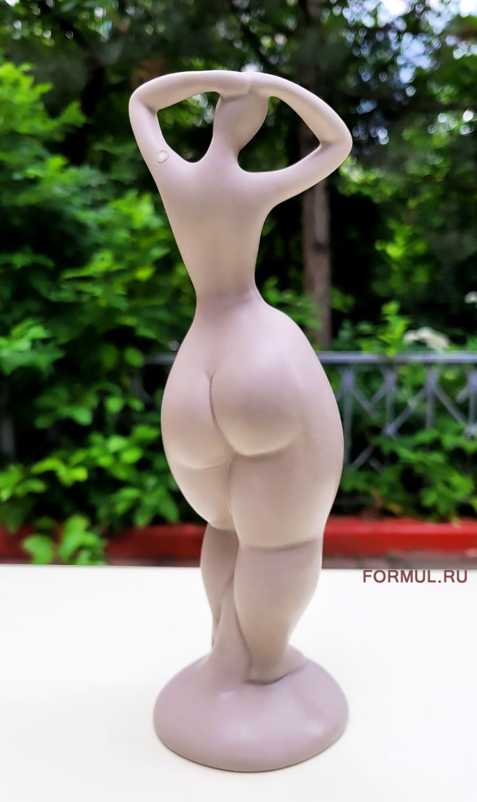Фигурка изготовлена из белой керамики, придающей ей гладкий, кремовый вид. Керамический материал создает ощущение элегантности и утонченности, которое контрастирует с необычными пропорциями фигурки.