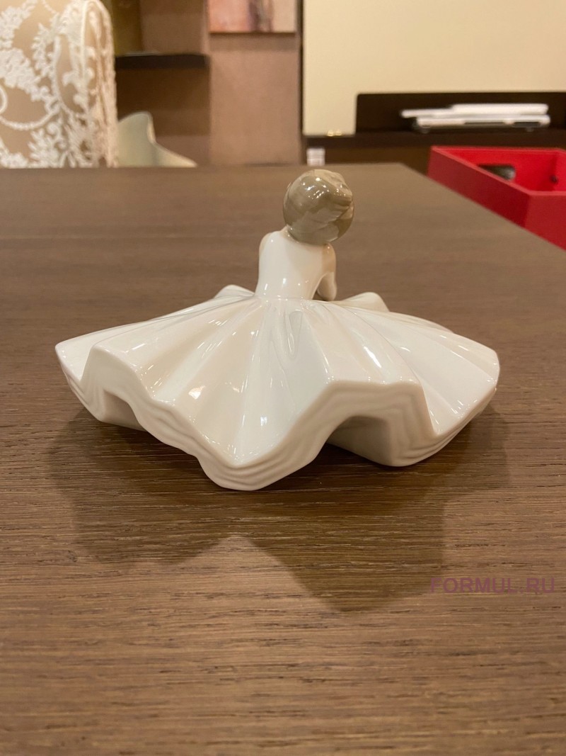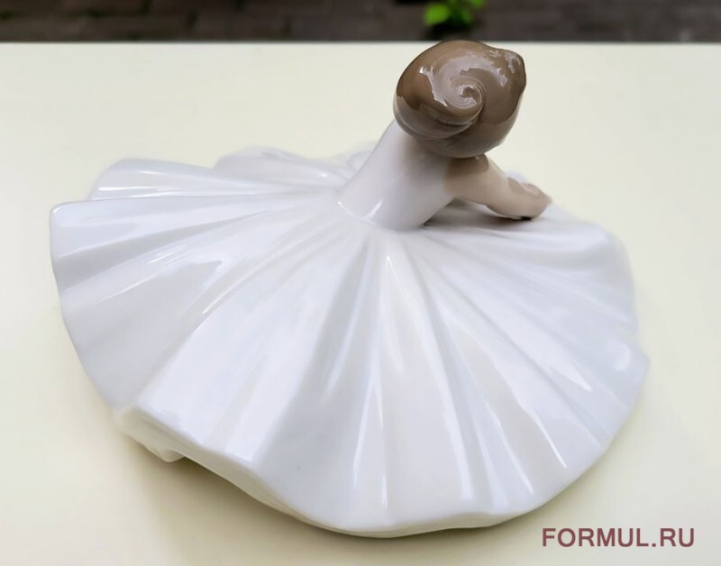 Юная балерина сидит на полу, при этом её вытянутые руки демонстрирует невероятную подвижность и легкость. Она одета в утонченный балетный костюм, который плавно стелется кругом вокруг неё. Её пачка - это настоящее произведение искусства. Изысканные ткани и декоративные элементы на костюме балерины придают фигурке особое очарование. Мастеру удалось передать "воздушность ткани" и воспроизвести все складки.