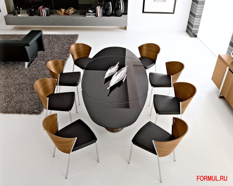 Продуманность и функциональность стола заключается в его раздвижной системе – без труда, лёгким движением руки, стол дополняется двумя элементами и приобретает форму эллипса. Таким образом, вполне компактный обеденный стол приобретает дополнительную плоскость столешницы, призванную увеличить количество посадочных мест. Стол Odyssey – невероятно изысканная модель, которая способна украсить собой любую современную гостиную или кухню-студию.