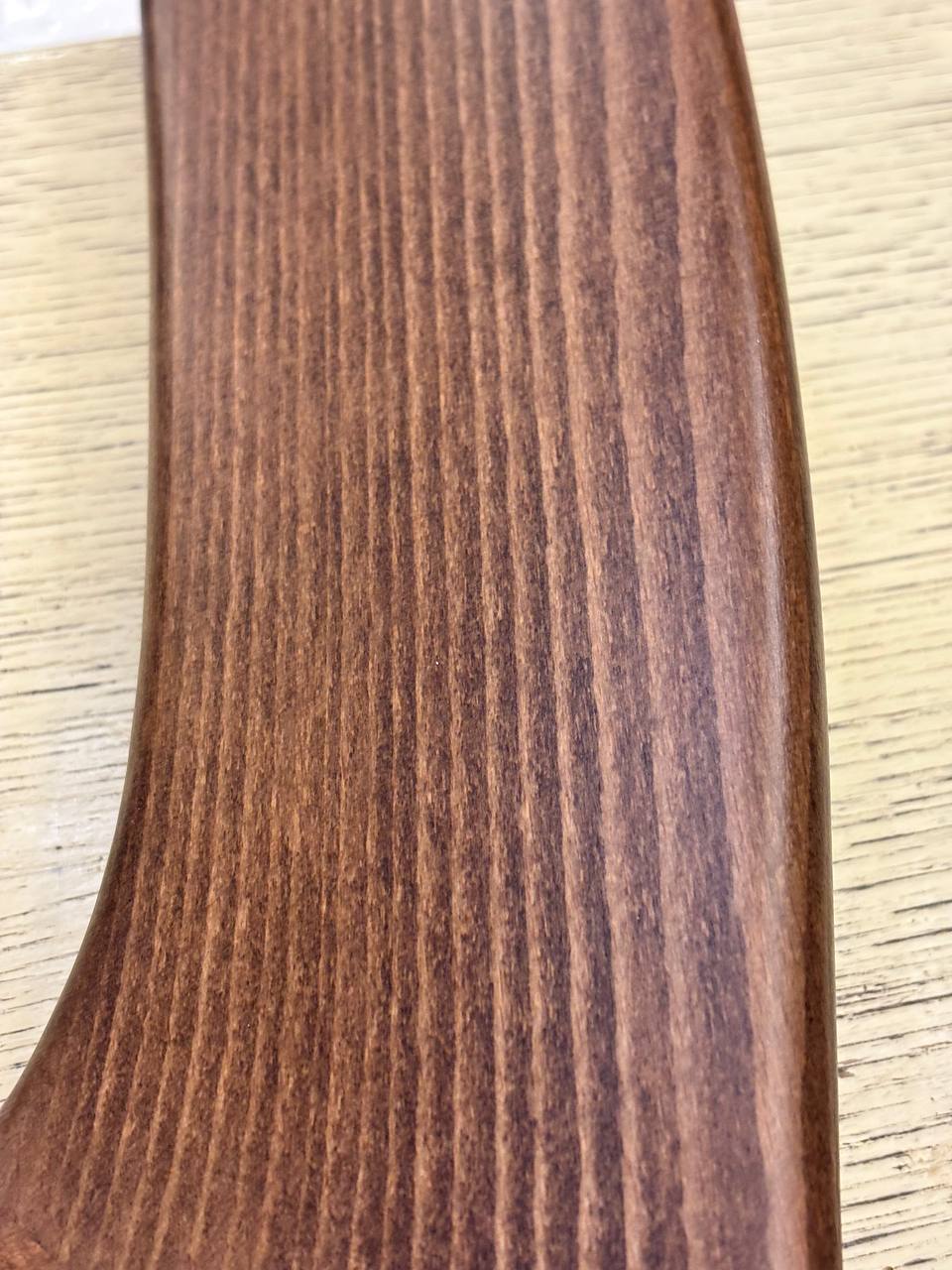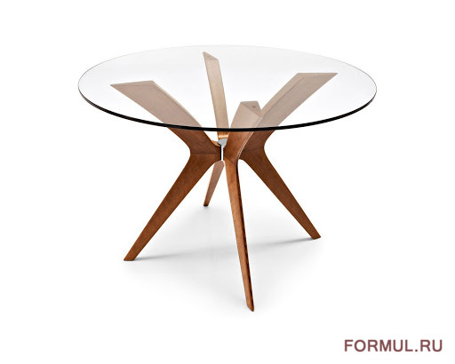 Стол смотрится легко и стильно, опираясь круглой столешницей, темной, из закаленного стекла, на металлическое основание, из которого расходятся четыре элегантные деревянные ножки. Ножки красиво изогнуты и расходятся лучами от их основания вверх, и кажется, это руки поддерживают стол, и вниз, создавая интересный рисунок подстолья. Ножки просвечивают через стекло, и это красиво и роскошно. Стол невероятно изысканен в своей простой красоте форм.