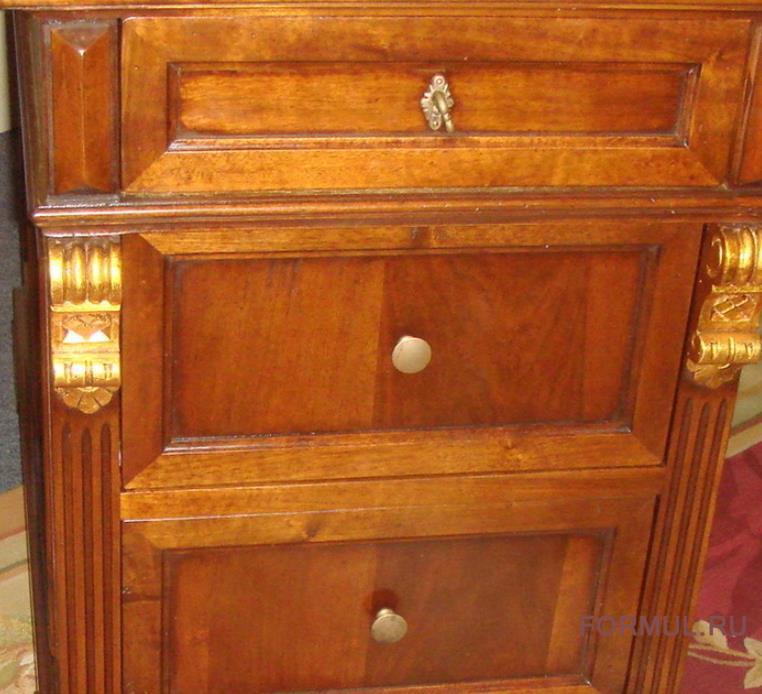 Столешница стола опирается на две тумбы, которые отделаны по бокам позолотой, что придает столу шик, и это очень красиво, стильно и оригинально. Тумбы имеют два ящика: один внизу, большой, и второй – поменьше объемом. Под столешницей расположились три выдвижных ящика. Очень комфортная стилистика стола для работы.
