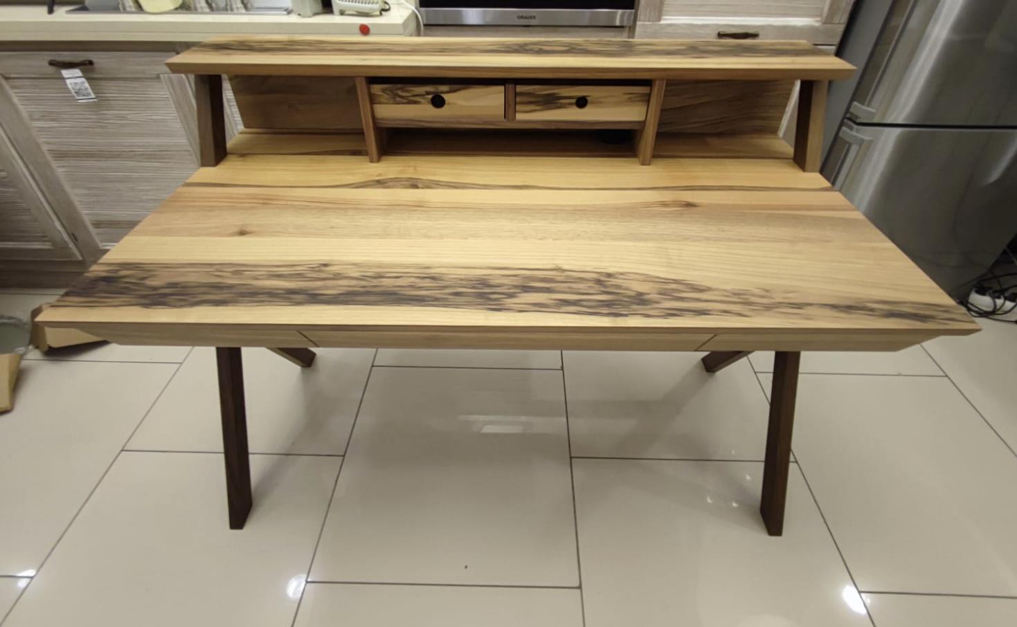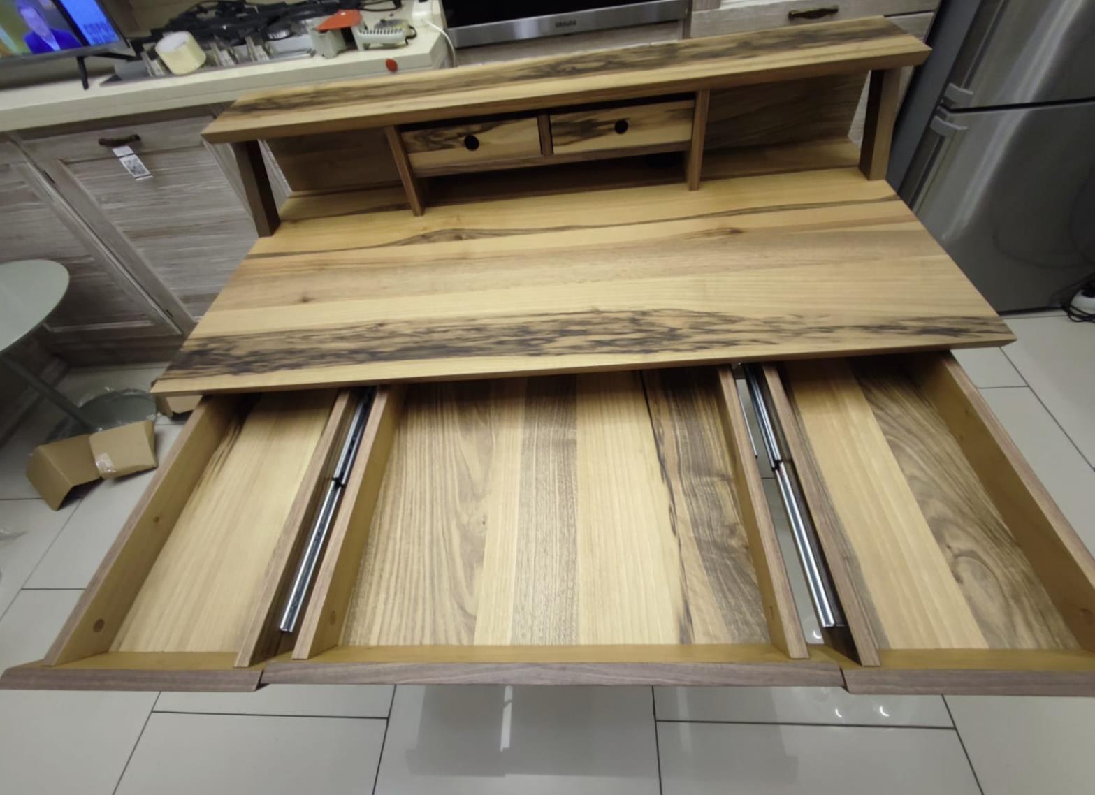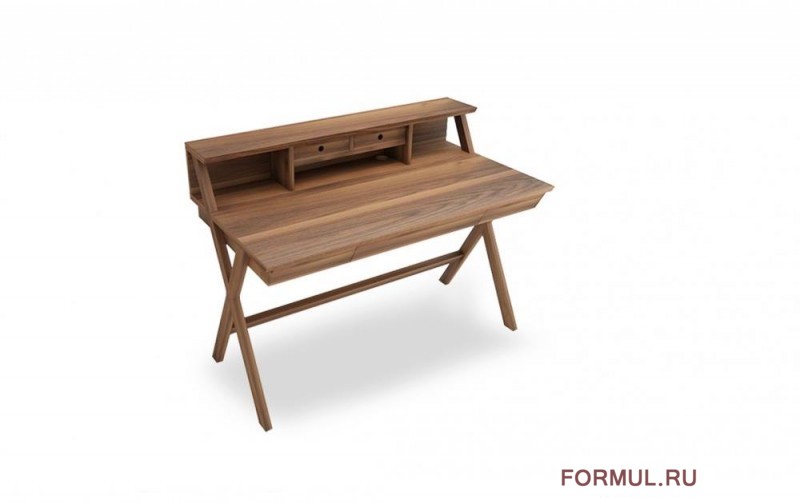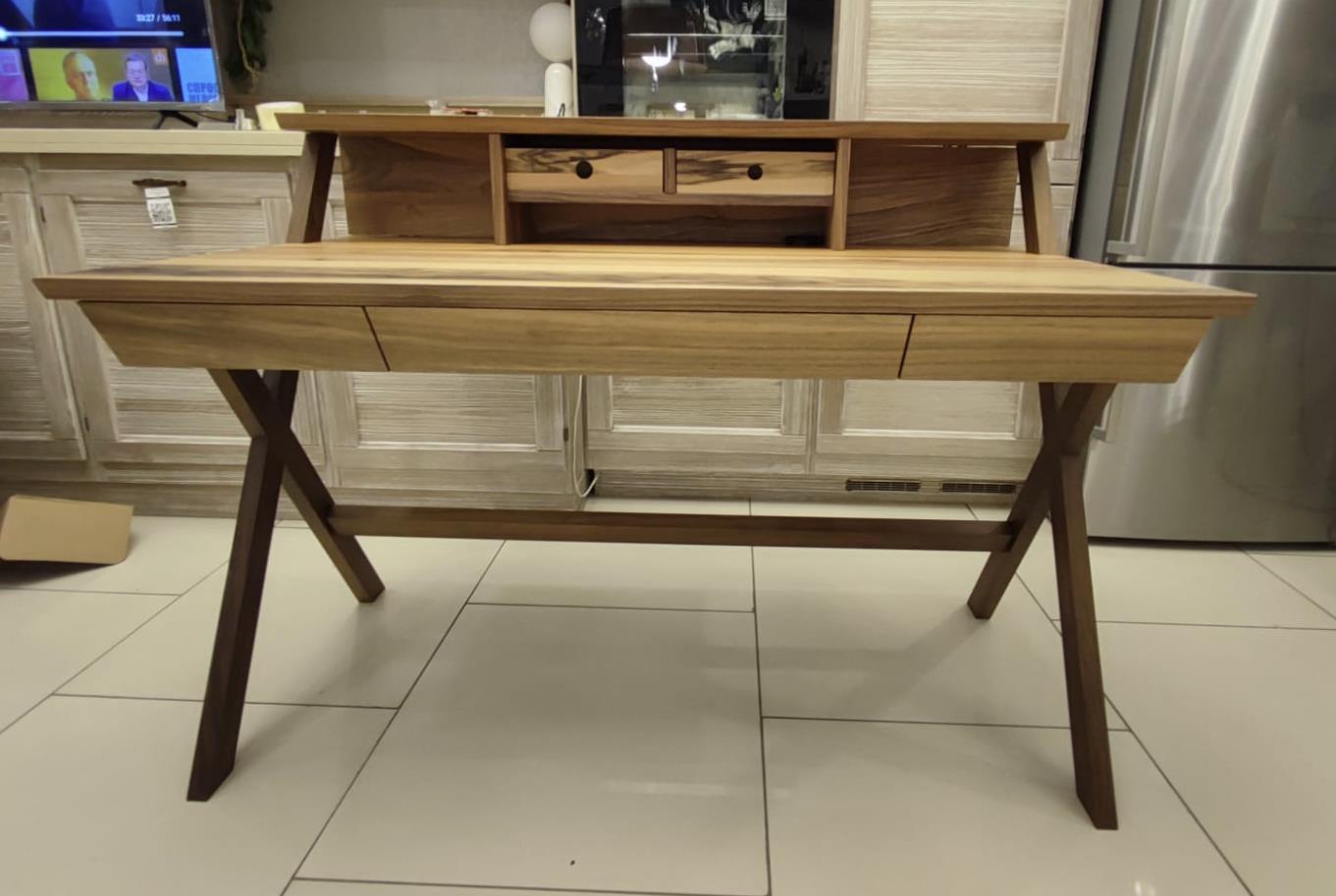 Cтол Oxford имеет столешницу из натурального шпона орехового дерева на МДФ и ножках из массива дерева. В столе расположено три глубоких ящика. На столешнице есть полка с двумя лотками , которая является неотъемлемой частью стола и не крепится отдельно.