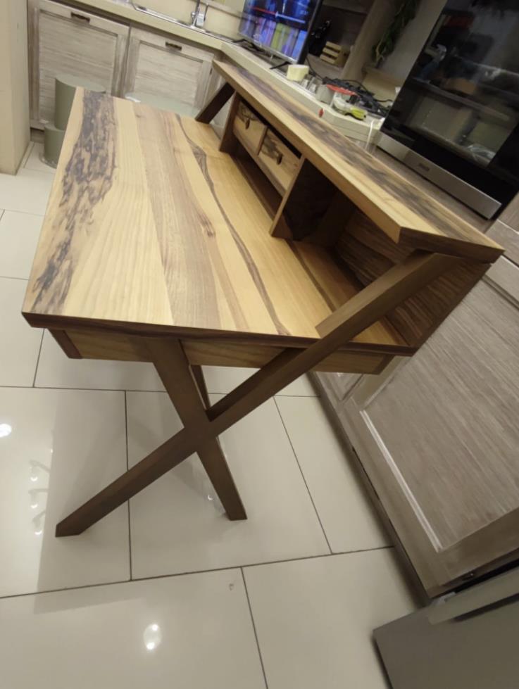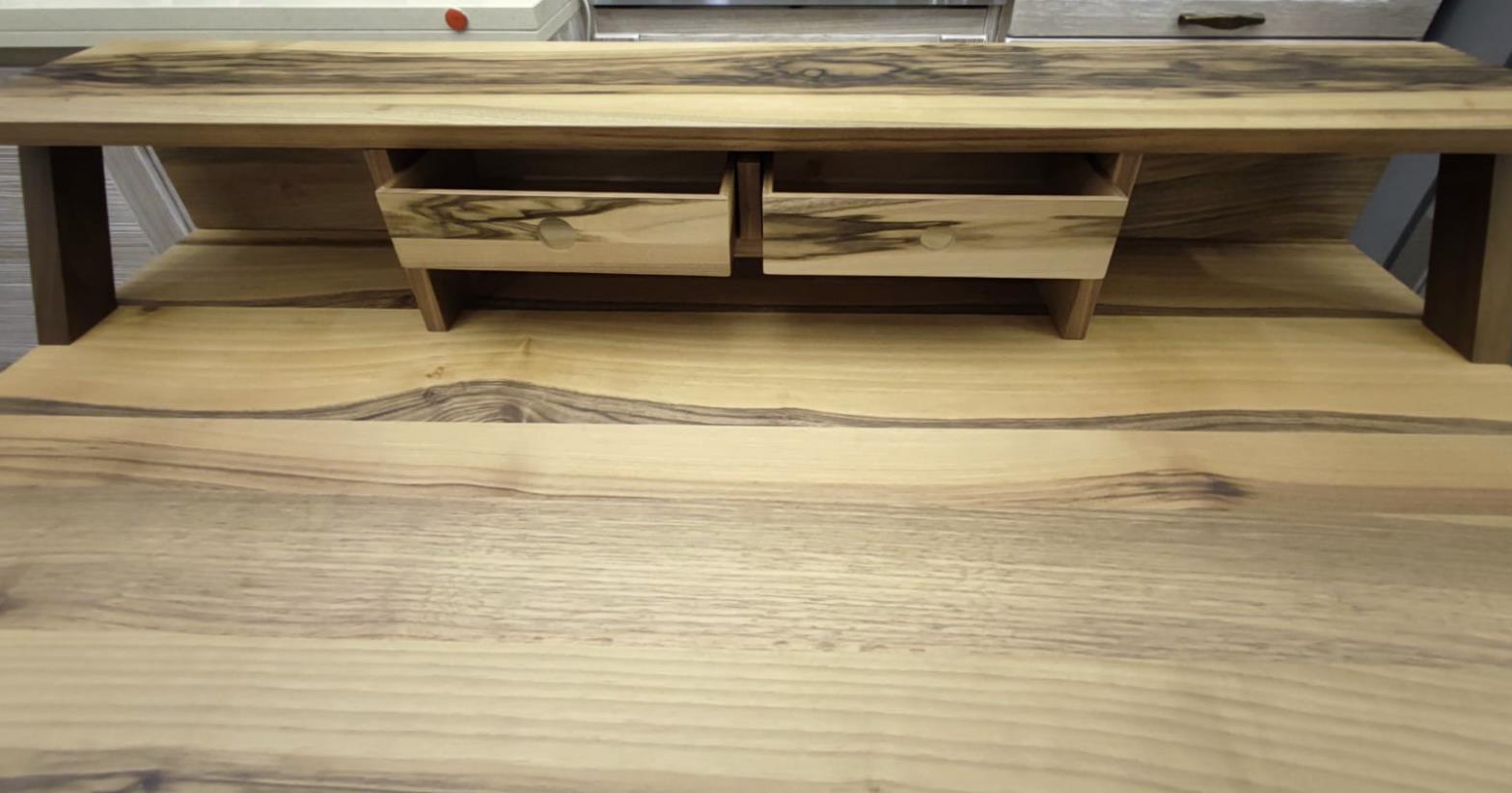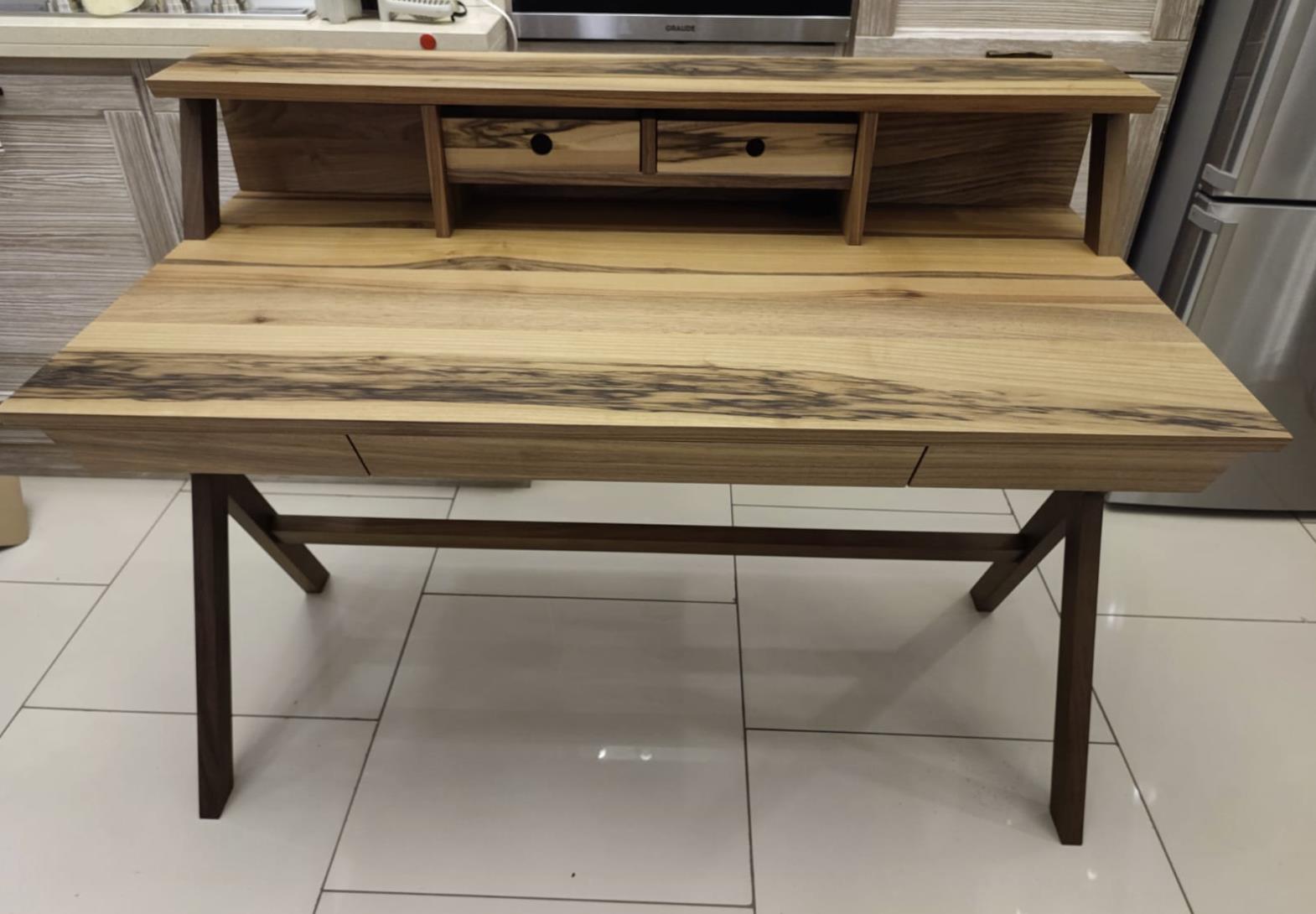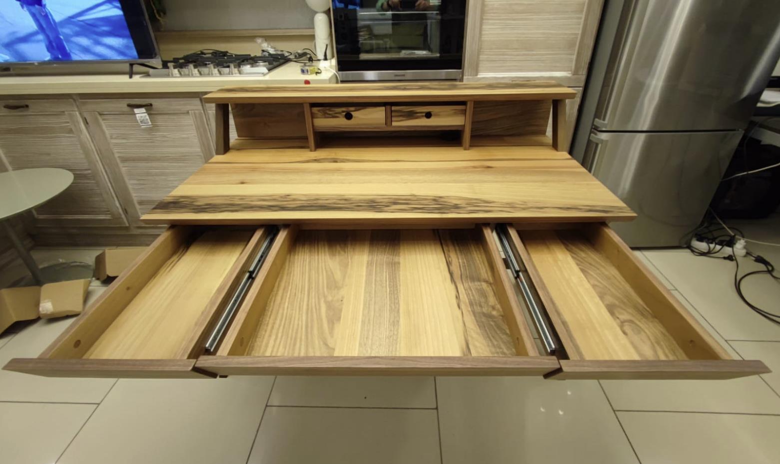 Cтол Oxford имеет столешницу из натурального шпона орехового дерева на МДФ и ножках из массива дерева. В столе расположено три глубоких ящика. На столешнице есть полка с двумя лотками , которая является неотъемлемой частью стола и не крепится отдельно.