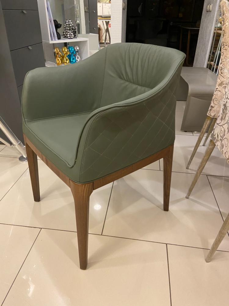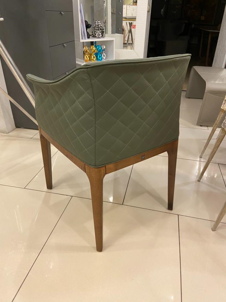 Спинка украшена строчкой. Обивка: темно-зеленая кожа (Pelle P42). Ножки из ореха каналетто (14 noce canaletto).