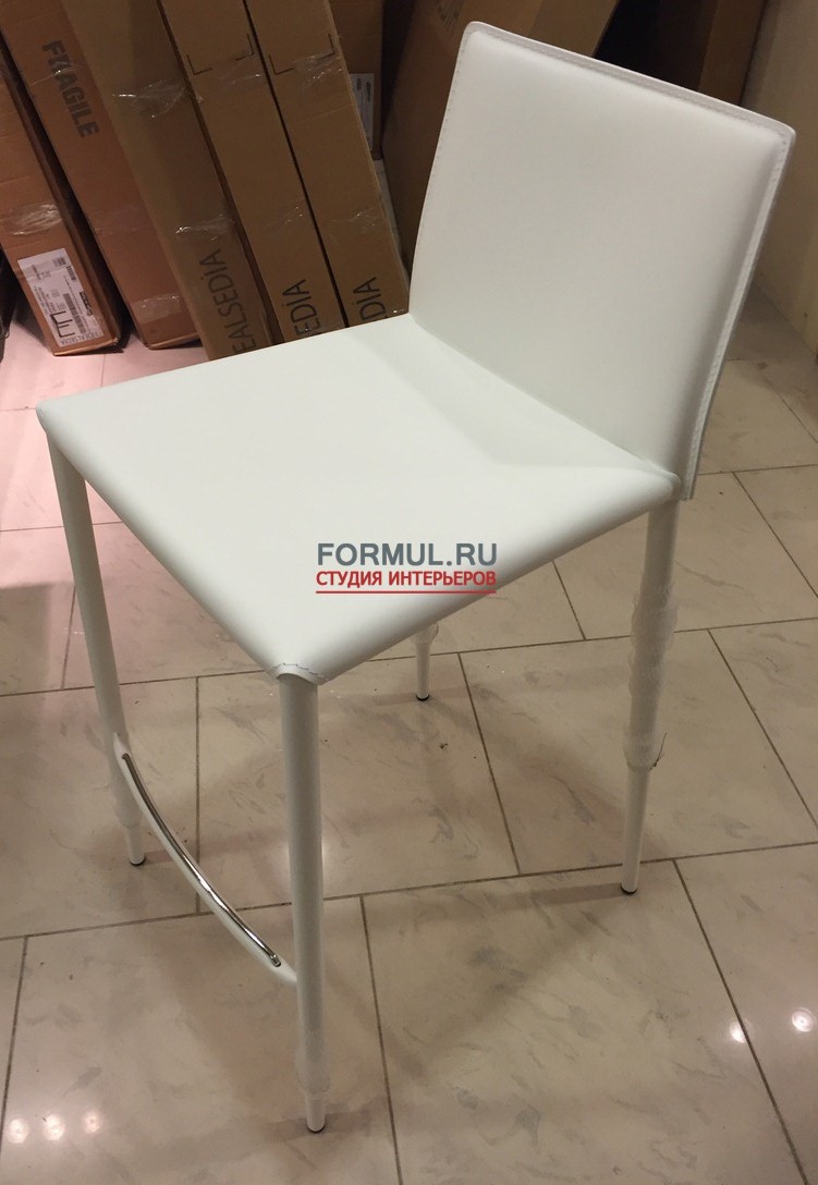 Каркас этого неотъемлемого барного элемента изготовлен из трубчатой стали, а другие элементы конструкции из регенерированной кожи. Этот вид кожи очень прочен и имеет высокую стойкость к химическим средствам для чистки. Цвет всех деталей конструкции подобран точно в тон друг к другу. Цветовое решение у этой модели одно – белое. В целом этот барный стул имеет прямоугольную форму, в нем присутствуют только прямые линии. Компания производитель предоставляет сертификаты об экологичности всех деталей этой модели.