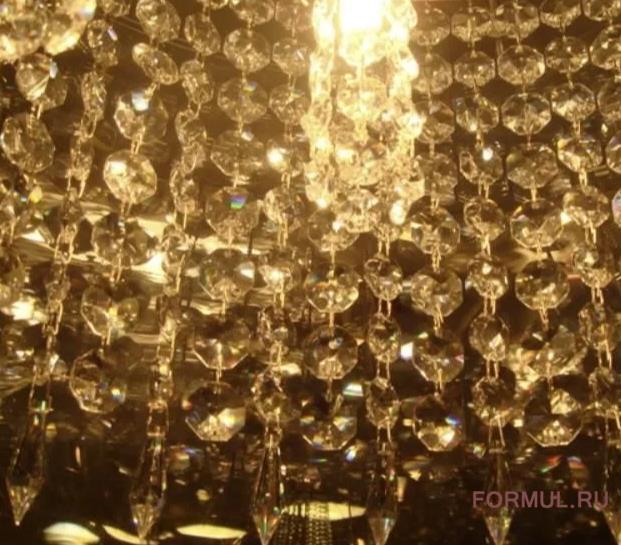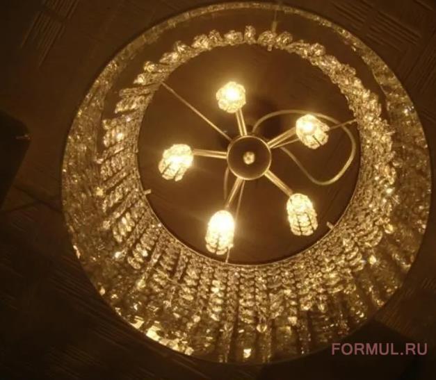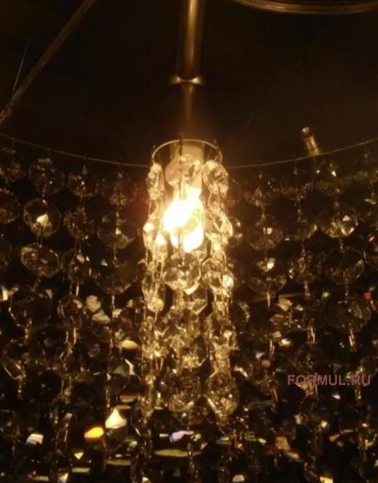 Наружная стеклянная колба собрала в себе большой круг подвесных круглых хрустальных капелек, которые заканчиваются удлиненными капельками, и все это образует абажур из хрусталя, внутри которого находятся пять маленьких абажурчиков из таких же хрустальных капелек, и именно они и являются источниками света, который, отражаясь в хрустале, преломляется и красиво играет музыкой света. При легком ветерке хрусталики-капельки будут тонко позванивать, создавая чарующий «аромат» музыки.