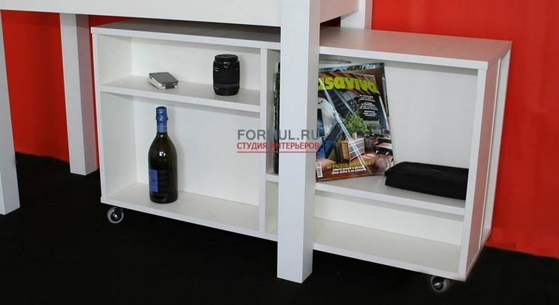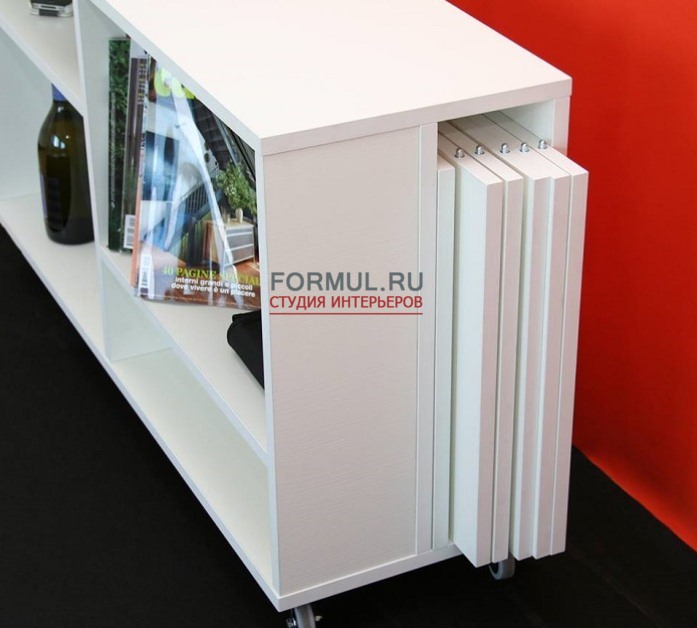 Она будет хороша и в рабочем кабинете, и в прихожей. Ее можно использовать на кухне в качестве полочки, в том числе и располагая дополнительные элементы по удобству. Главное её функциональное использование - в нее помещаются вставки от стола-консоли Magic Consolle. Также тумба убирается под консоль, занимая минимум места в помещении. С легкостью убирается под кухонный стол и выдвигается когда нужно, тумба очень удобна на вечеринках, по ее поверхности без опасений можно перемещать бокалы и напитки.