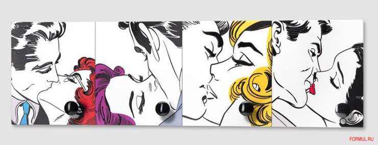 Неординарное оформление прихожей - громкая заявка уверенных современных хозяев. Остальные помещения квартиры не должны уступать первому сильному впечатлению, а достичь такой последовательности непросто. Но если Вы на это осмелились, то изделие BACIAMI ANCORA итальянской фабрики Pintdecor изготовлено для Вас. Вешалка представляет собой вытянутую панель с 4-мя ручками-крючками. Фоном служит зарисовка подобия комикса. Художник не поскупился на яркие акценты, выделил чувственные детали, изобразил на едином полотне различные эмоции и характеры. Цветовой вызов уравновешен строгими черными штрихами. Мастер использует достаточно грубые линии очертаний лиц - прием, который раскрывает неподдельную страсть, душевный порыв. Изготовитель не пытается завуалировать основное назначение вещи: крючки не скрыты в рисунке, наоборот, полотно поддерживает заданный стиль - лаковые детали изображения выполнены в тон черных, покрытых глянцевым лаком ручек. Еще одна черта практичности вешалки - грамотное исполнение рисунка над крючками, что дает возможность полноценного использования вещи, не закрывая панно. Эпизоды картины как четыре двери в чужую неизведанную жизнь. Пусть Ваш гость задастся мыслью: что же за историю скрывает каждое изображение.