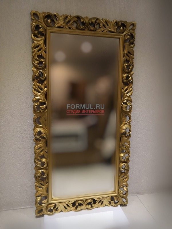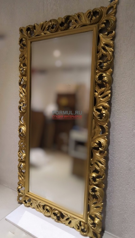 человека. Зеркало имеет резную раму, выполненную в форме листьев. Рама имеет темно золотой