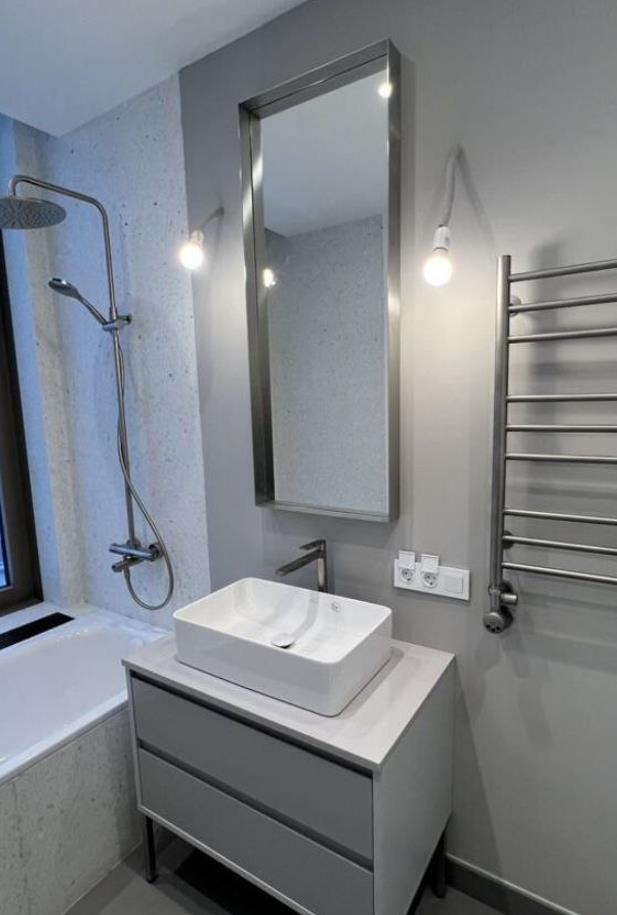 Отлично смотрится в строгой, минималистичной ванной. Также подходит к гостиным и прихожим в стиле лофт.