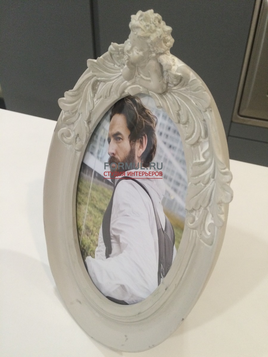 Жанр рамки – ангел, расположенный наверху и смотрящий вниз. Рамка и форма для фотографии – овальная, украшена симметричными узорами до середины рамки. Сам ангел прорисован в мелких деталях. Композиция фоторамки успокаивает, умиротворяет, напоминает о чистоте и невинности.