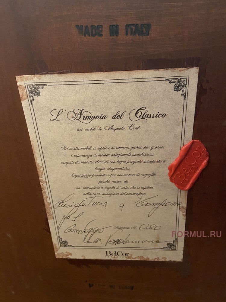 Сзади буфета - подпись от мастера, который изготовил это произведение искусства. Примерный перевод: "Гармония классики. Мебель Августо Корти. Каждое произведенное изделие является предметом гордости, потому что в него вложен труд и опыт мастеров-краснодеревщиков"