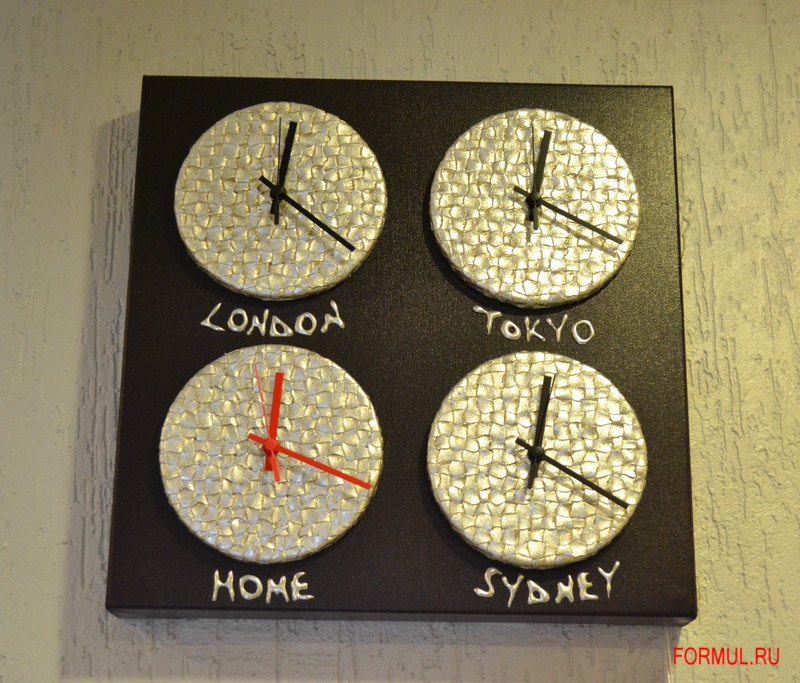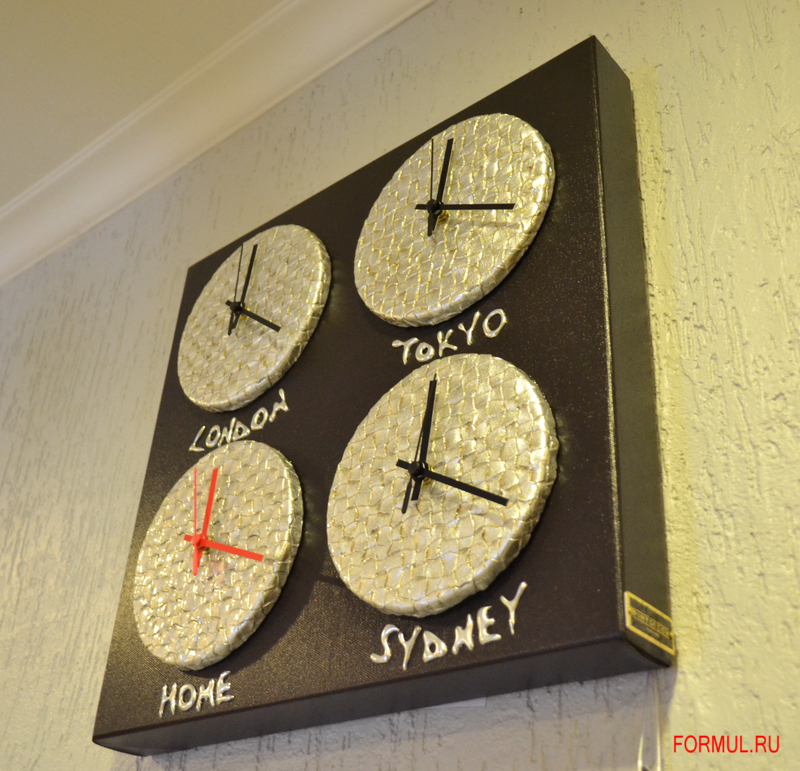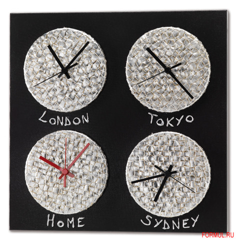 Стильные часы от итальянской фабрики Pintdecor. На часа 4 циферблата соответствующие разным городам мира. Конечно, ничего не мешает вам выставить время на каждом циферблате по вашему усмотрению.