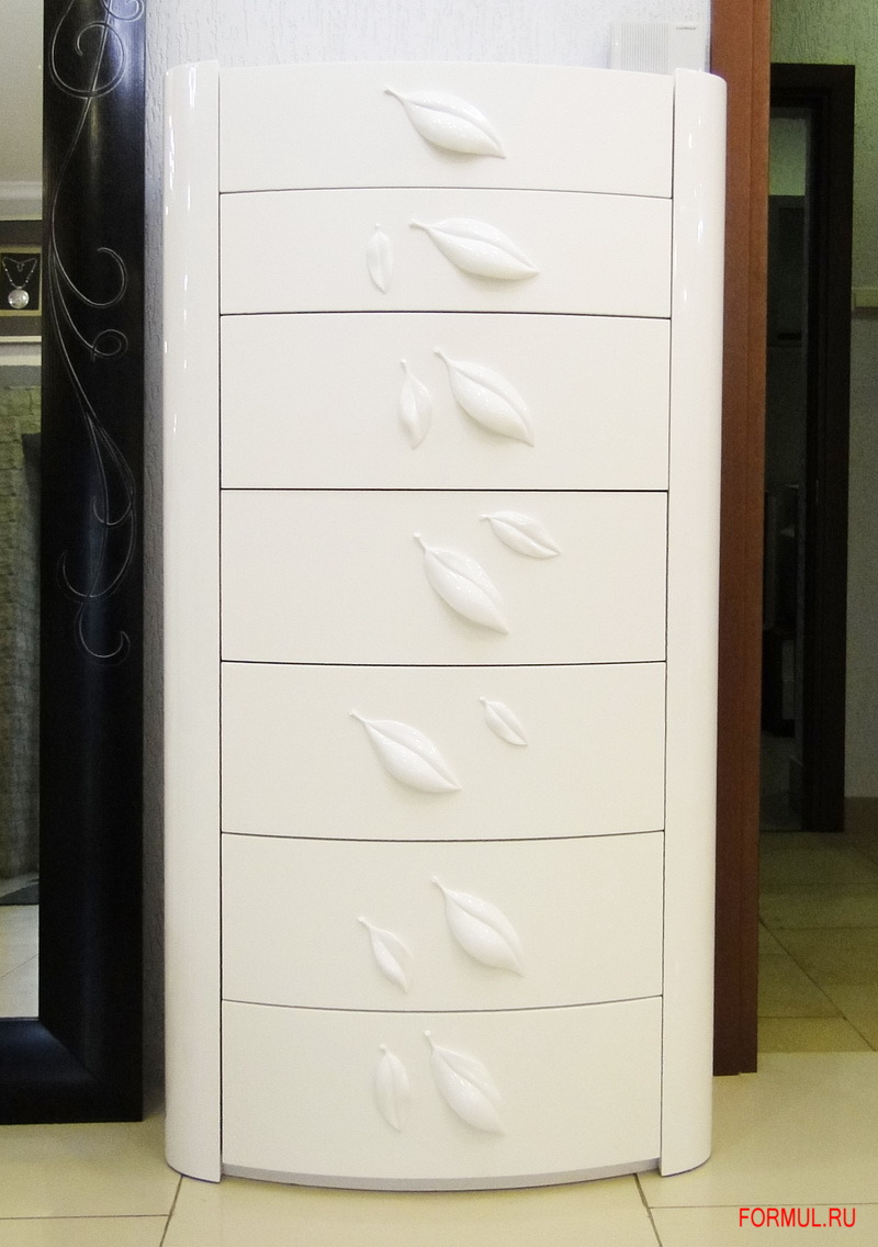 Трудно описать словами красоту комода с семью ящиками итальянской фабрики BBelle, настолько он роскошен. Во-первых, белый цвет всегда нарядно, празднично и торжественно. Белоснежный комод, покрытый глянцевым лаком в 7 слоёв – уже притягивает взоры. Но на комоде фабрики BBelle, на фасаде каждого выдвижного ящика, изумительной красоты объёмный декоративный элемент из пластика в виде нежных виноградных листочков, которые выполняют функцию ручек. И в этом декоративном оформлении, в этих неповторимых «виноградных ручках» столько шарма и очарования, что хочется назвать этот предмет настоящим шедевром мебельного искусства.