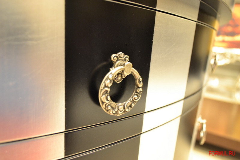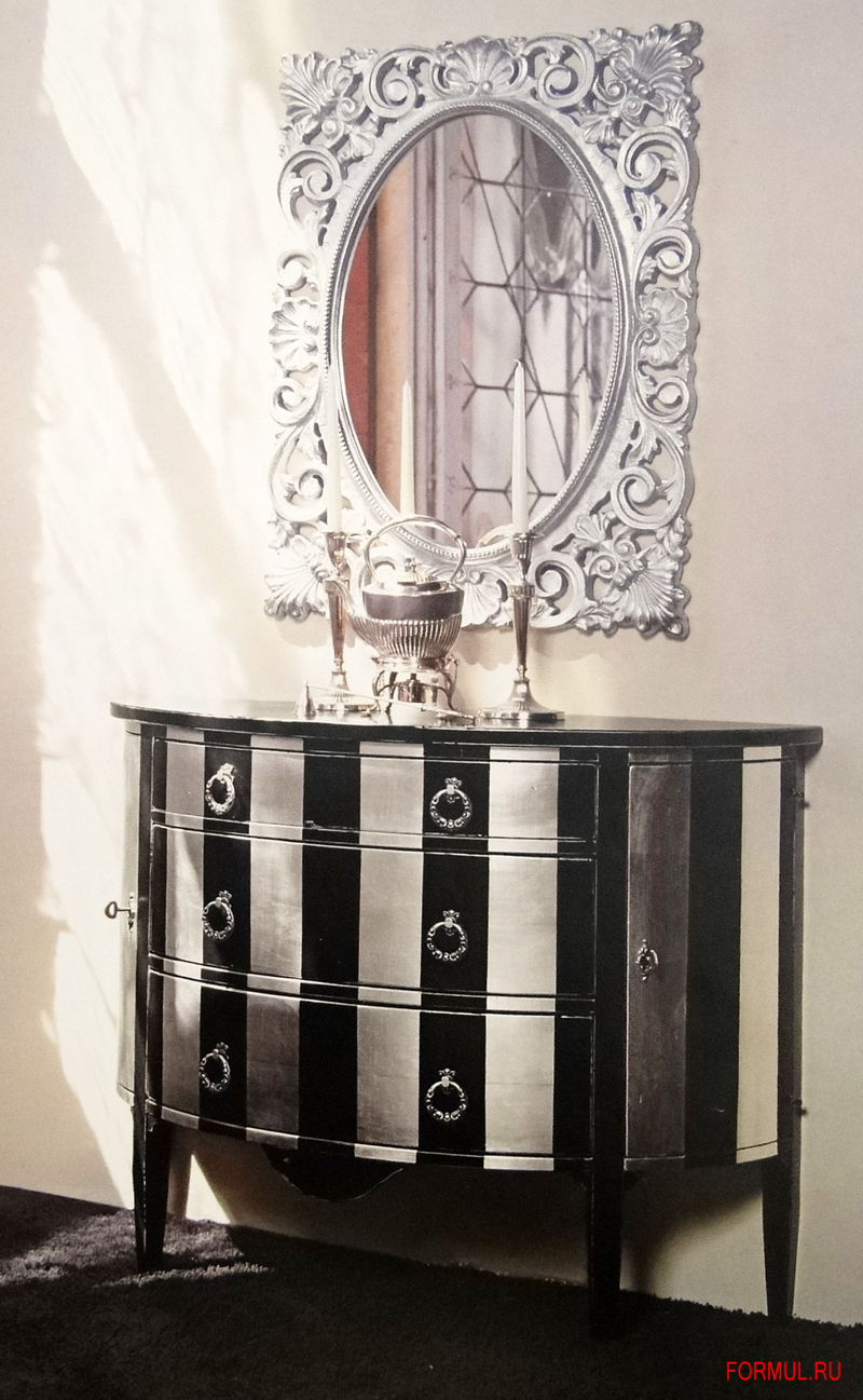 Данный комод является очень оригинальной дизайнерской находкой. Серебристая вертикальная полоска довольно неординарное решение цветового оформления для мебели. Комод оформлен в этих цветах и смотрится изысканно. Стиль, в котором изготовлен этот небольшой комод, стопроцентная классика «прованс». Эта модель привлекательна не только эксклюзивным дизайном, но и своей функциональностью: три выдвижных ящичка и две боковые распашные дверки позволяют хранить в этом комоде всевозможную мелочёвку, которой постоянно не находится места.