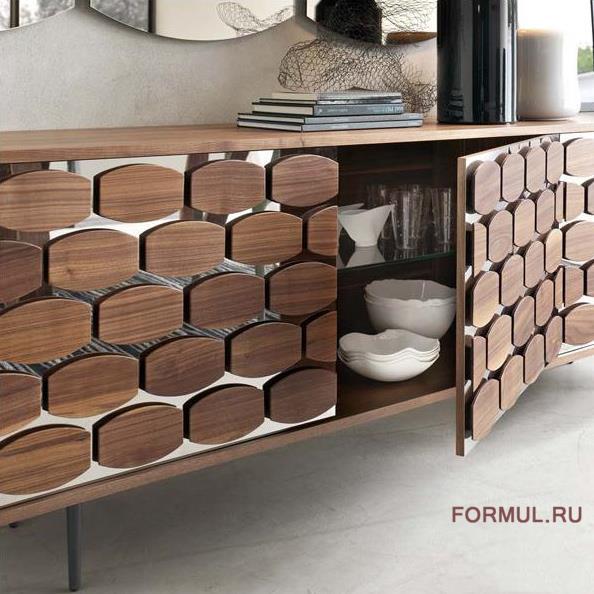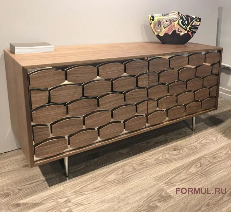Комод Honey от фабрики Tonin Casa — настоящее произведение искусства от итальянских мастеров. У комода замечательное оформление фасада ячейками из массива, которое притягивает взгляд и вызывает восхищение. Плоские фигурные дощечки напоминают соты.