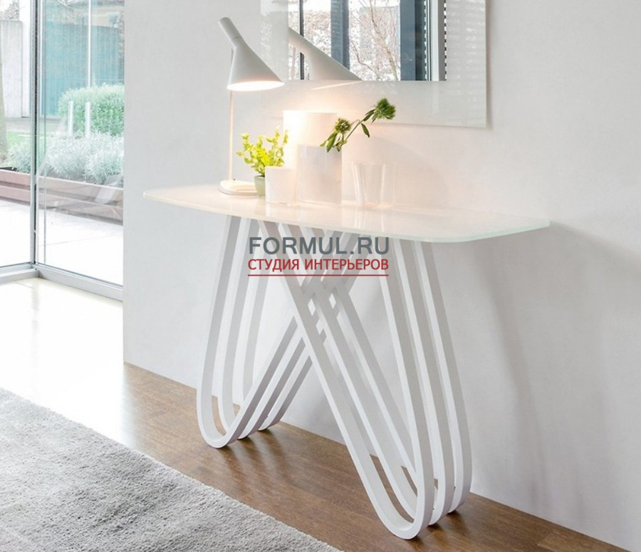 Яркость белого стекла, из которого изготовлена верхняя часть консоли, акцентирует внимание на любом предмете, который Вы захотите на ней разместить. Ваза с цветами, небрежно брошенная стопка журналов или оригинальная статуэтка, будут смотреться наиболее выигрышно на фоне блеска белогого стекла. Но особое очарование консоли придает ее основание. Несколько изогнутых ножек переплетаются между собой в оригинальном узоре. Сочетание цветов изделия настолько гармонично, что станет прекрасным дополнением к уже имеющемуся мебельному гарнитуру. Консоль идеально подойдет в качестве использования в роли тумбы или трюмо, если над ней расположить большое и красивое зеркало. Кроме того, она визуально расширяет пространство в помещении.