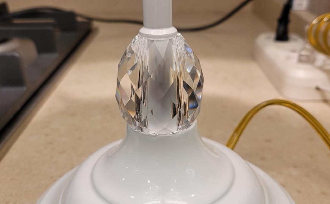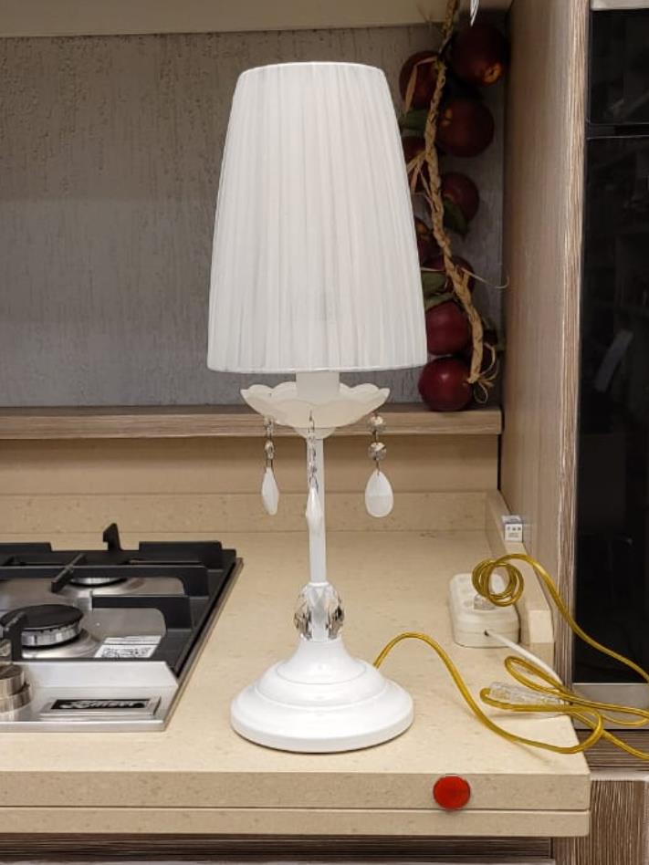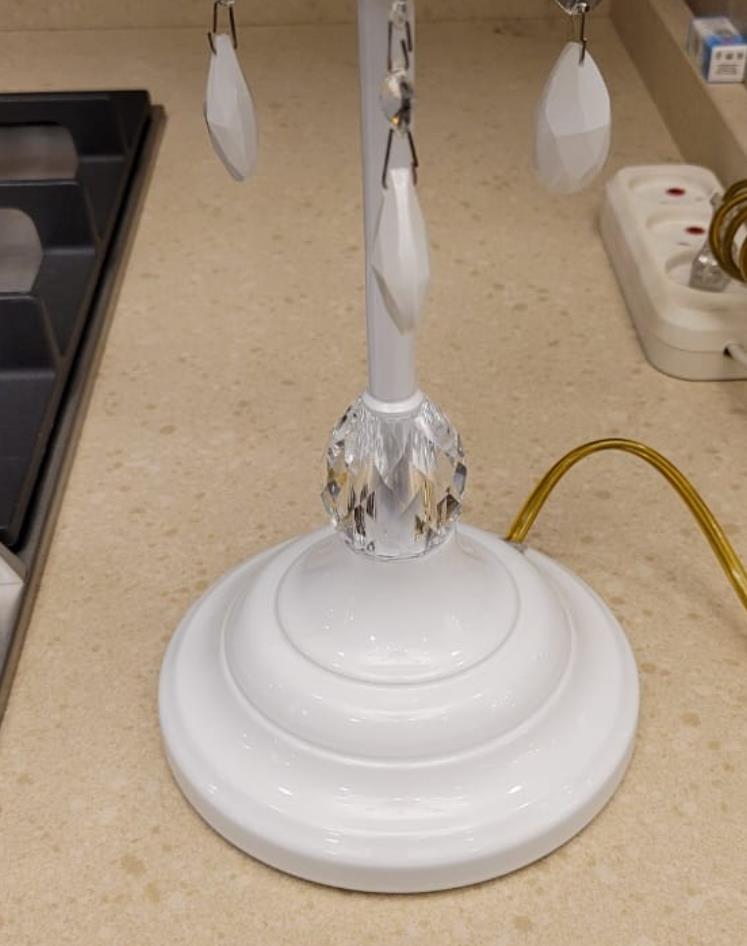 Созданная в нежном стиле, она восхитительно изящна. Белый абажур из органзы собран в воздушный плафон вытянутой формы и похож на цветок на тонкой грациозной ножке, а усиливает этот эффект резная чаша, небольшая, визуально поддерживающая плафон. Ножку украшает Сваровски, аналогичные, но чуть меньше стразики, как капельки росы, ниспадают от чаши, очаровательно покачиваясь, если их задеть, издают мелодичный звук капели.