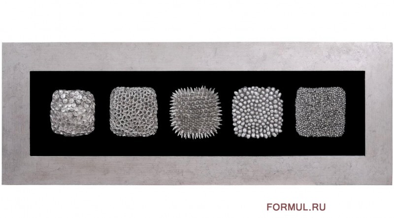 Панно "5 форм 1" — это настенное панно из композитного материала в раме из шпонированного МДФ под стеклом. Цвет рамы патинированное серебро, цвет панно - серебристый металлик. Подложка выполнена из фанеры обтянутой черным холстом. Данное панно можно вешать на стену как вертикально так и горизонтально.