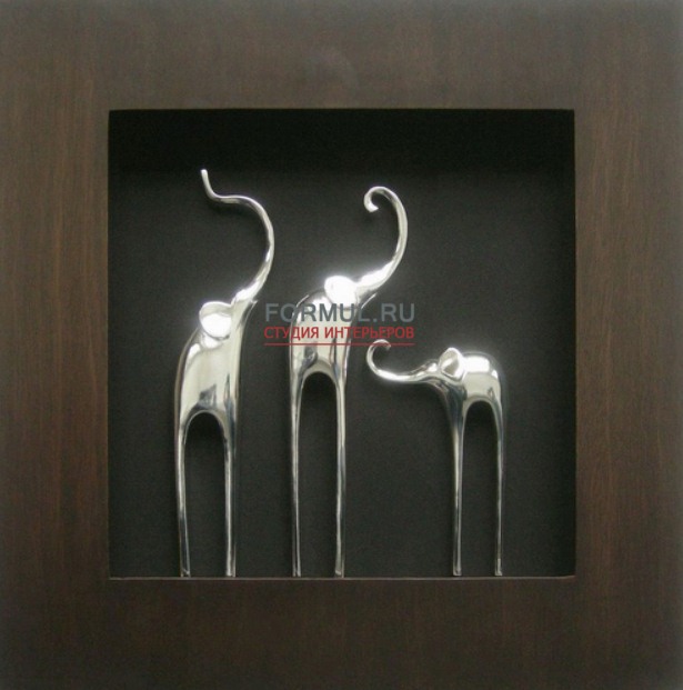 Слоны изображены в абстрактном современном стиле, они гораздо более изящны, чем мы привыкли видеть этих животных. В этом изяществе и заключена яркая индивидуальность данной работы. Прекрасно продумана и деревянная рама в цвете венге, которая выгодно подчёркивает изысканные и роскошные серебряные фигурки.