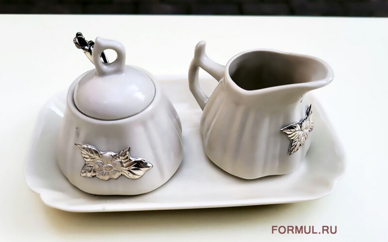 Комплект выполненн из высококачественного фарфора и дополнен декоративными элементами из серебра. Ручная работа гарантирует высокое качество изделий и их долговечность.