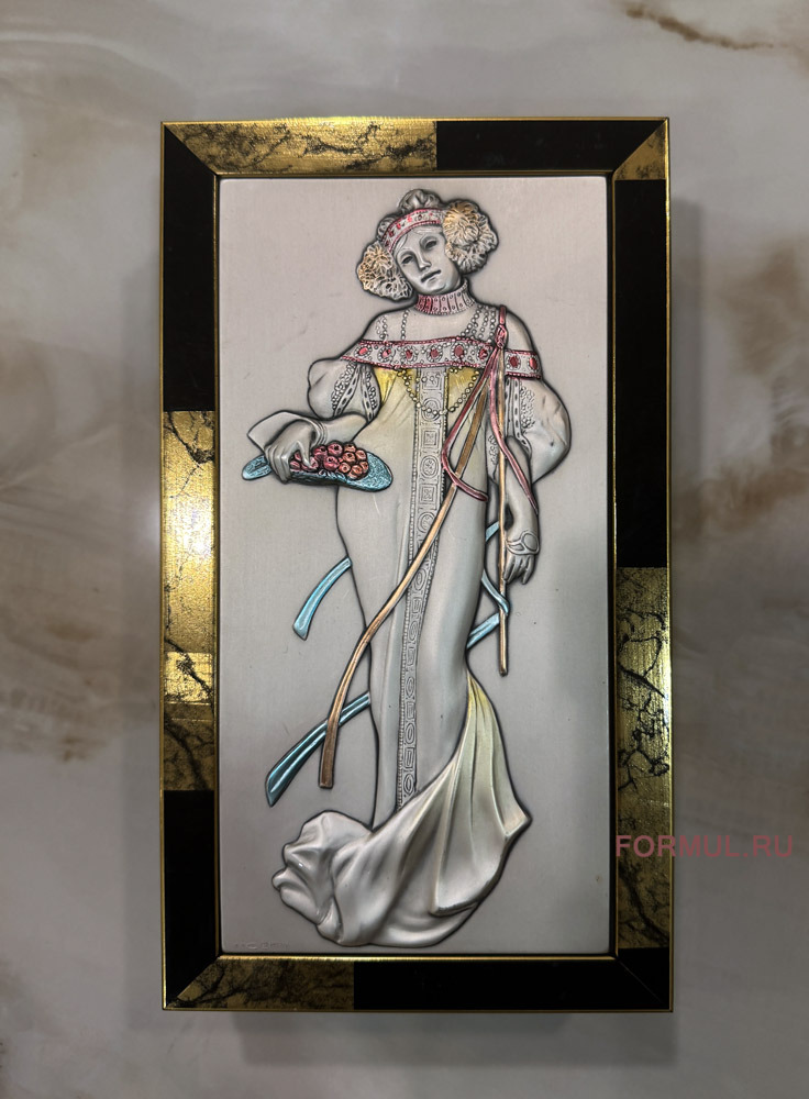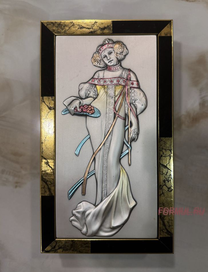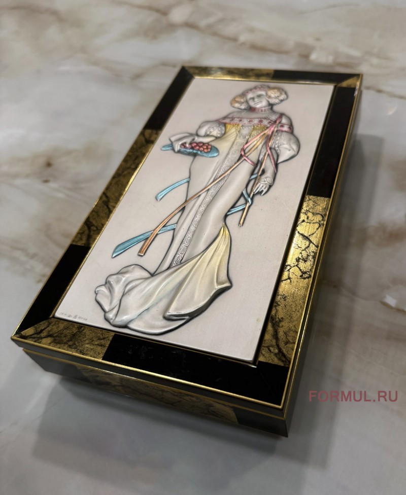 Завораживает своей красотой изготовленный с потрясающей точностью рисунок девушки в нарядном платье на крышке шкатулки.