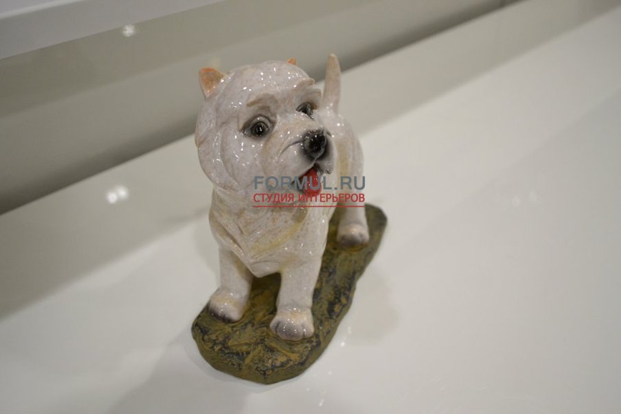 Размеры болонки – 80х180х190мм. Собака исполнена в белом цвете с желтыми полосами на тельце. Особенно пронзительные глаза напоминают настоящее животное, мирно резвящееся на лужайке.