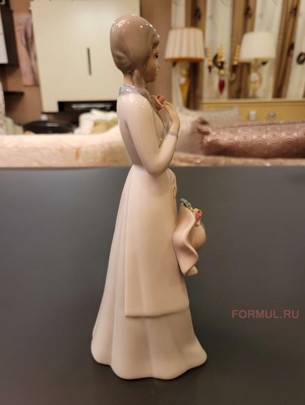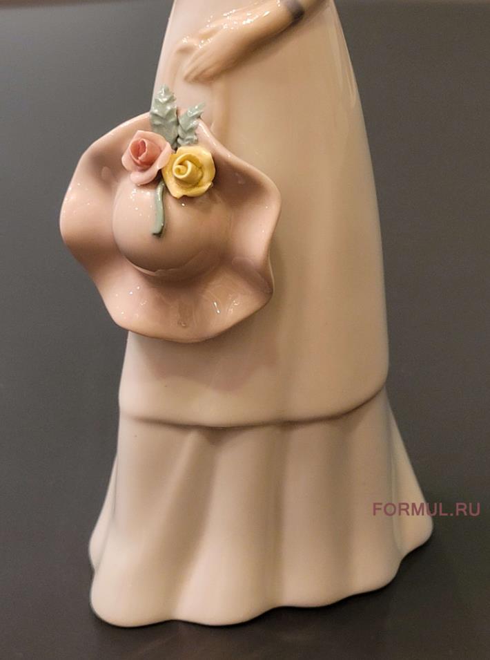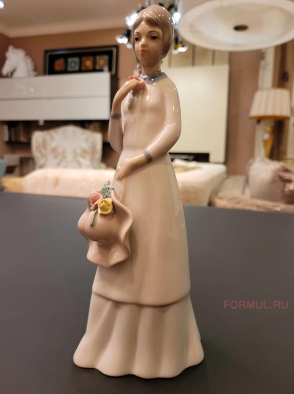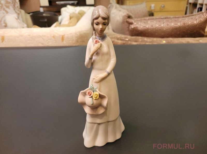 Женщина изображена с теплой и открытой улыбкой, одной рукой, держащей мастерски выполненный бутон розы, а другой держащей соломенную шляпу. Цветок, который она держит, искусно сделан, с нежными лепестками яркого, насыщенного цвета. Он служит дополнением женской красоты и придает фигурке дополнительный штрих элегантности.. Она одета в светлое платье, которое подчертивает ее изящную фигуру, складки на полах платья создают ощущение движения от легкого бриза. Лицо у нее безмятежное, что делает ее идеальным дополнением к любой комнате, которая нуждается в спокойствии и красоте.