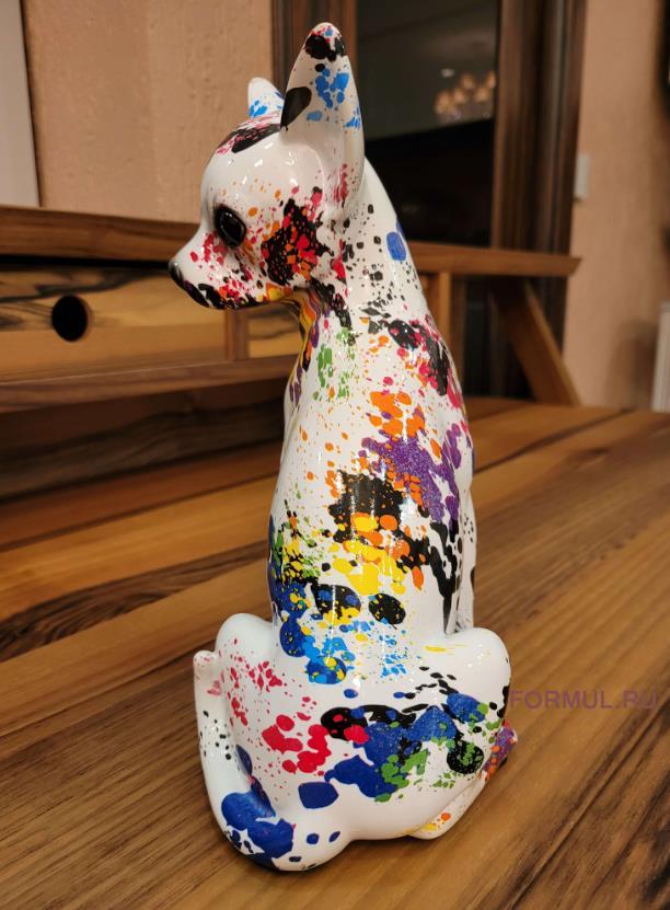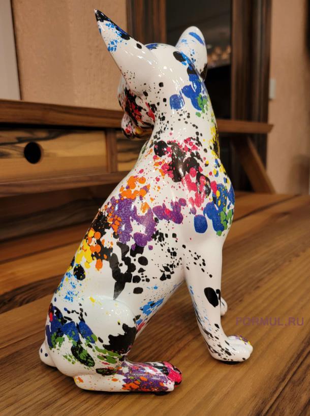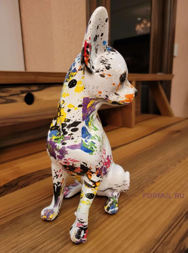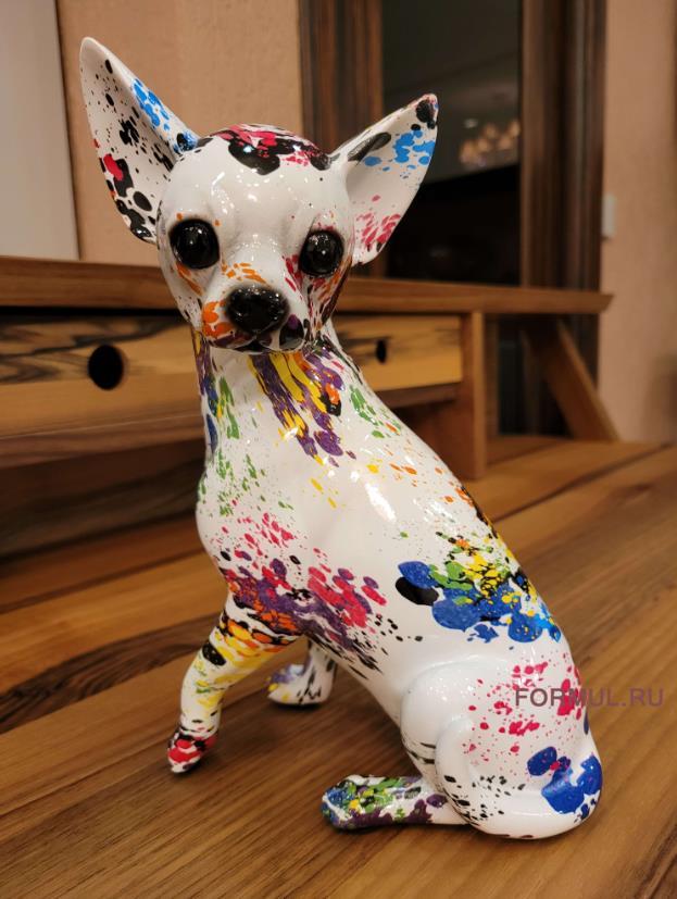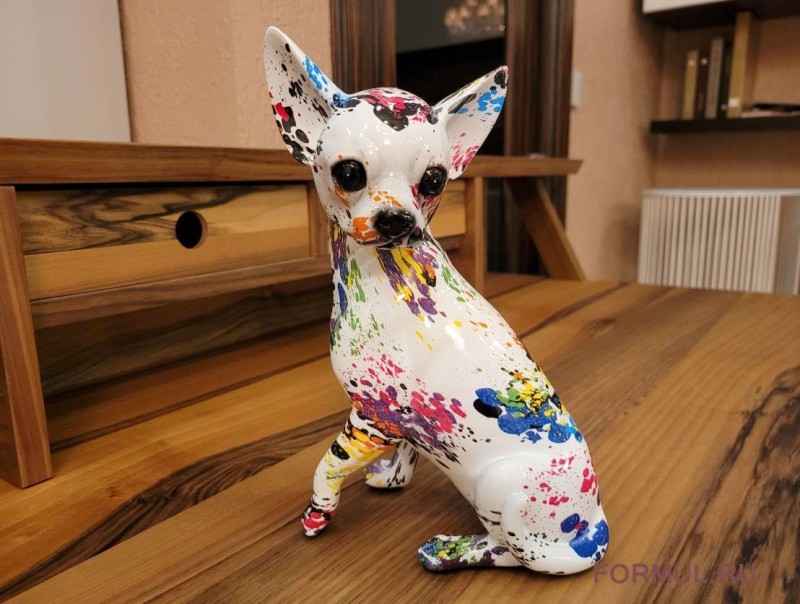 Этот чихуахуа обладает поразительной детализацией и реализмом, отражая их характерные черты: большие, внимательные глаза, изогнутый хвост и лишь характерный окрас шерсти тут заменен на ручную покраску выразительными цветами. Очаровательная статуэтка оживит ваш интерьер и придаст ему особый шарм.
