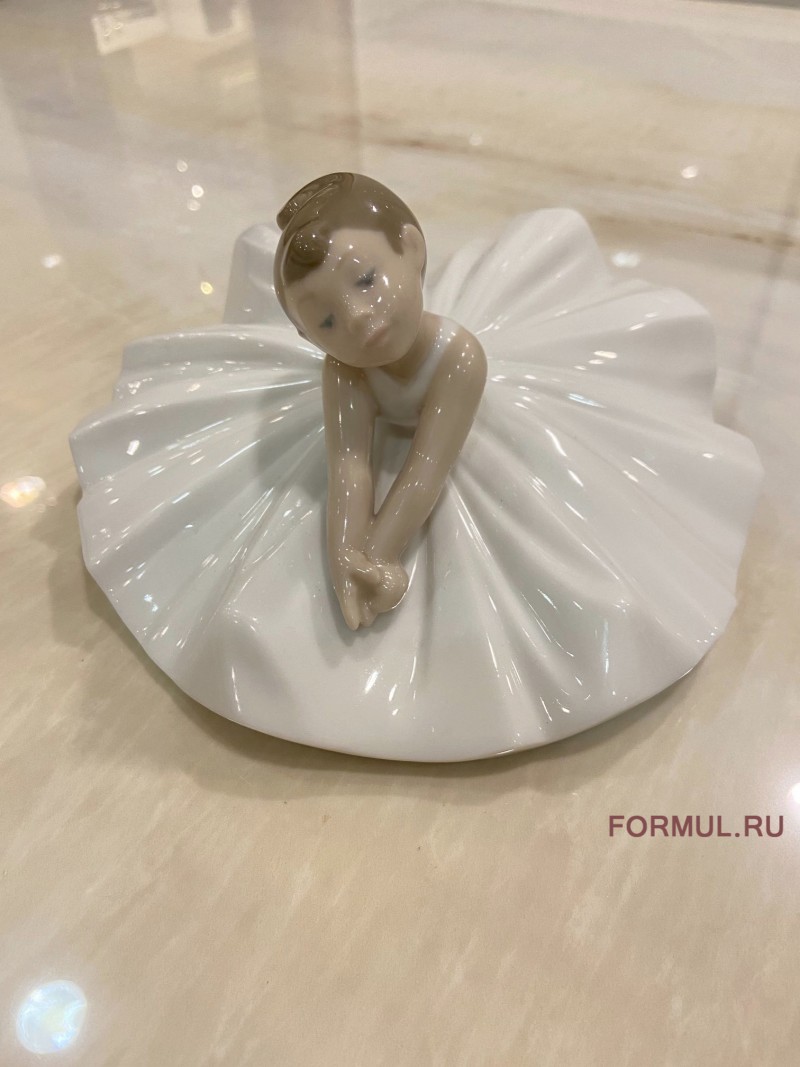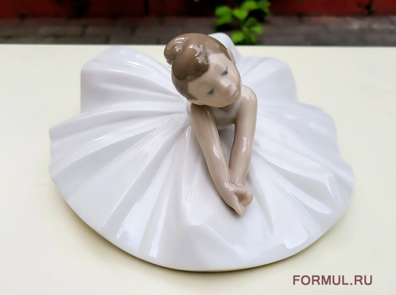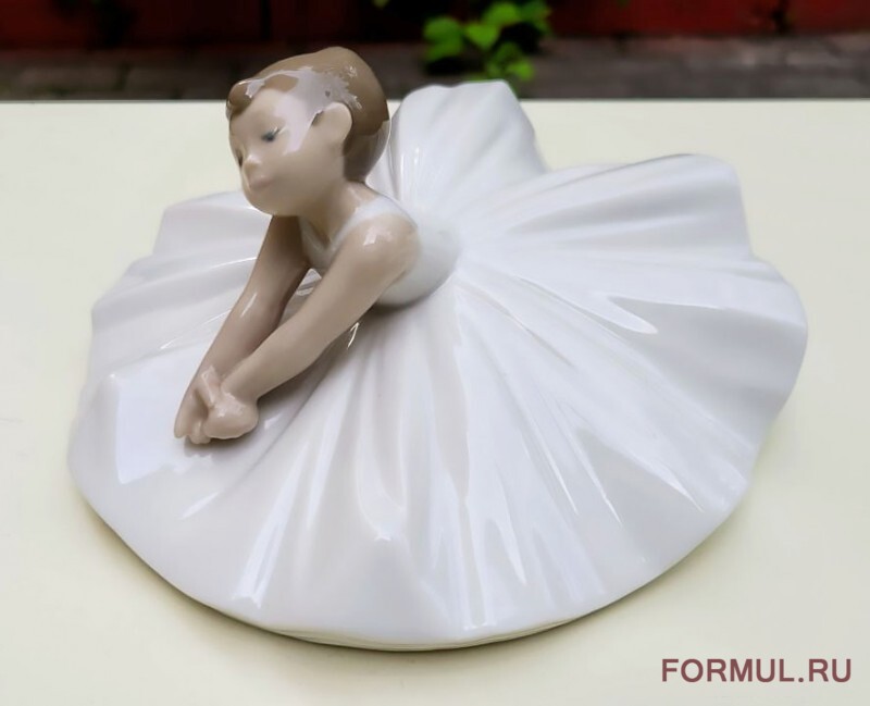 Юная балерина сидит на полу, при этом её вытянутые руки демонстрирует невероятную подвижность и легкость. Она одета в утонченный балетный костюм, который плавно стелется кругом вокруг неё. Её пачка - это настоящее произведение искусства. Изысканные ткани и декоративные элементы на костюме балерины придают фигурке особое очарование. Мастеру удалось передать "воздушность ткани" и воспроизвести все складки.