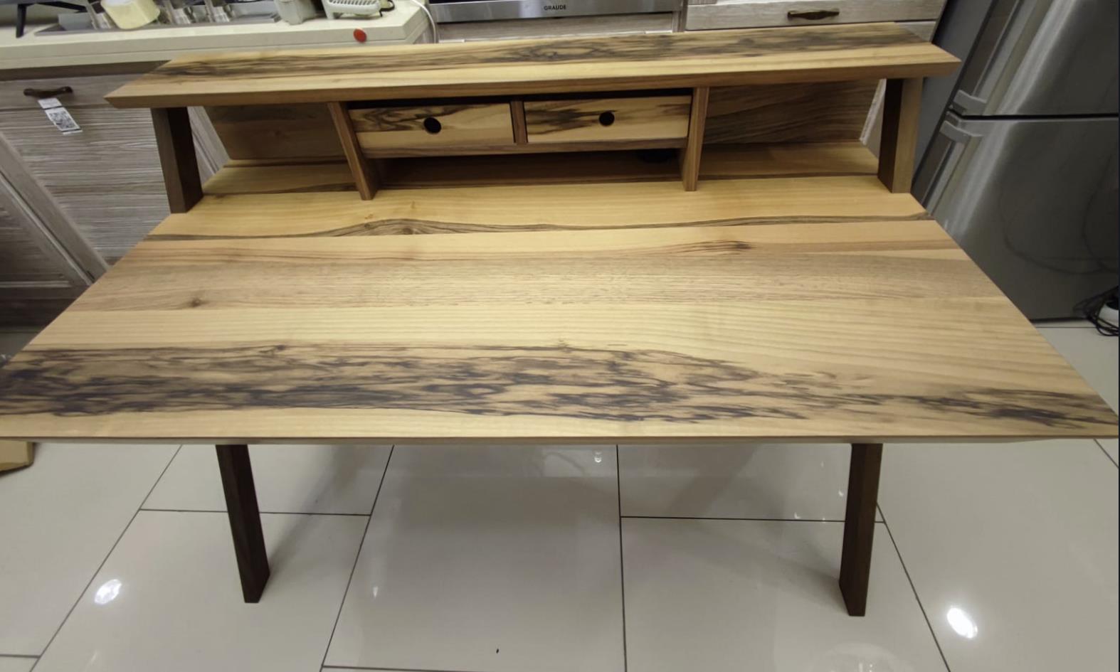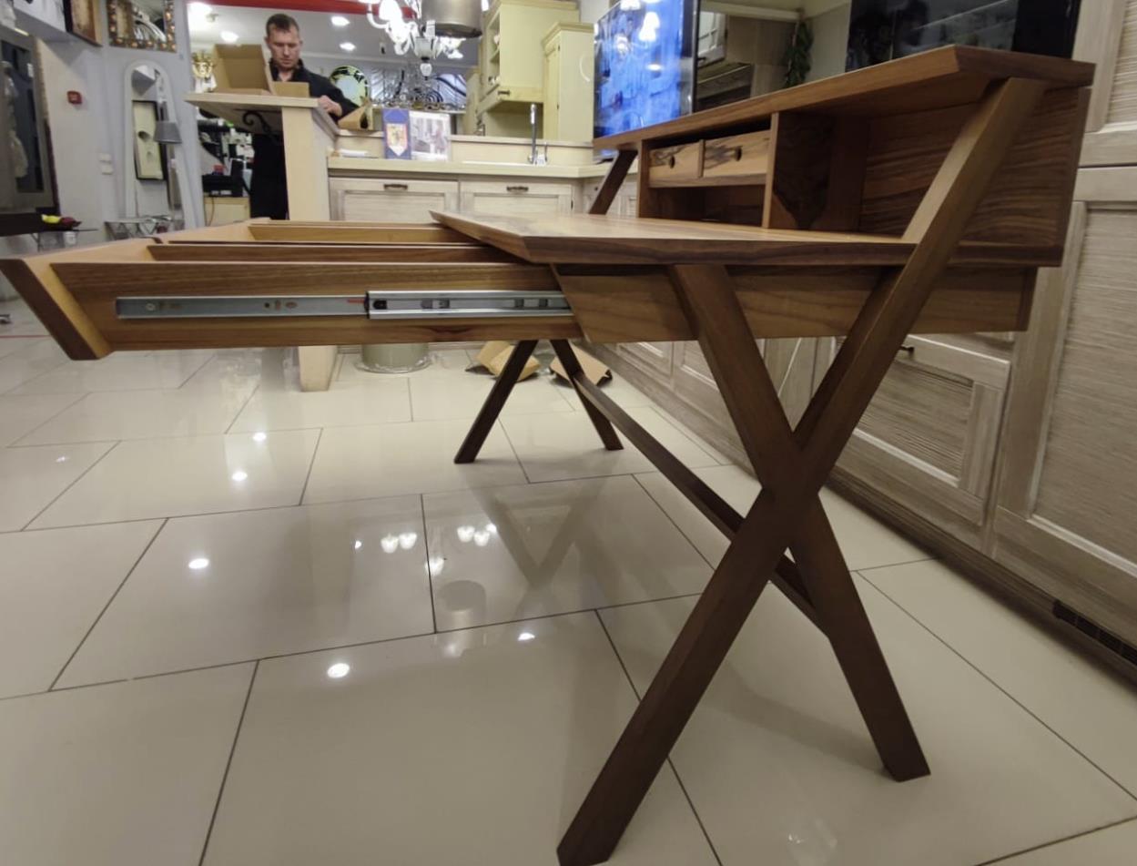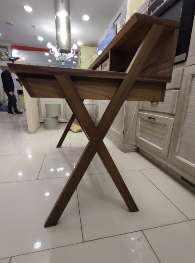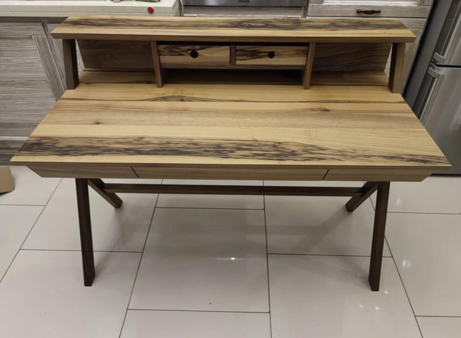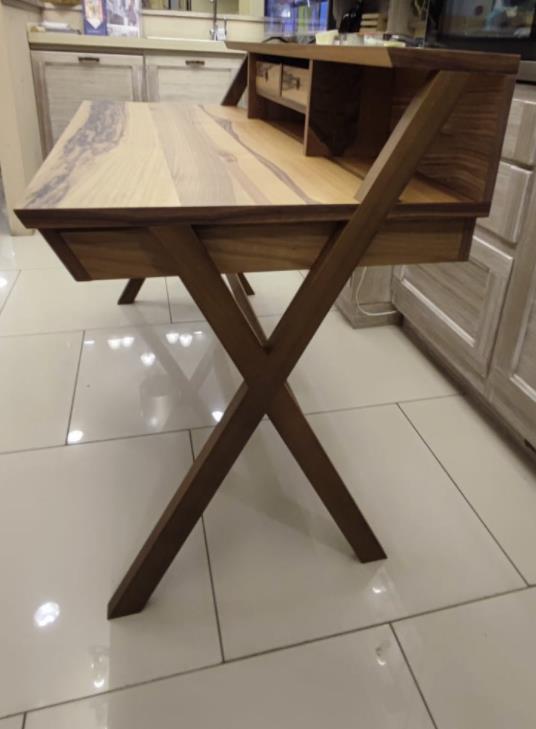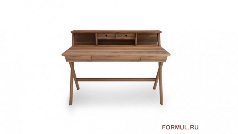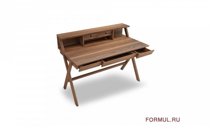 Cтол Oxford имеет столешницу из натурального шпона орехового дерева на МДФ и ножках из массива дерева. В столе расположено три глубоких ящика. На столешнице есть полка с двумя лотками , которая является неотъемлемой частью стола и не крепится отдельно.